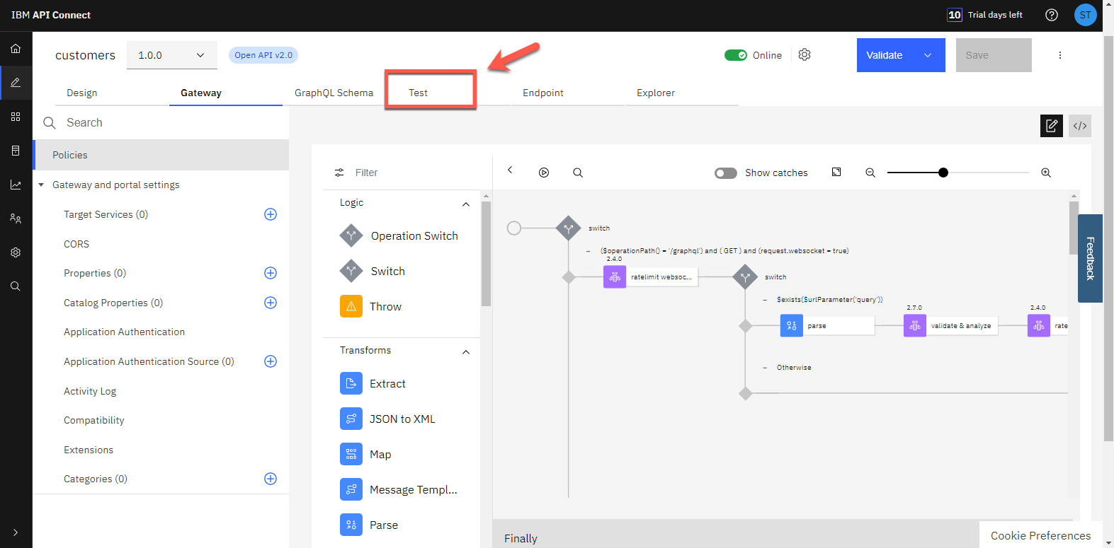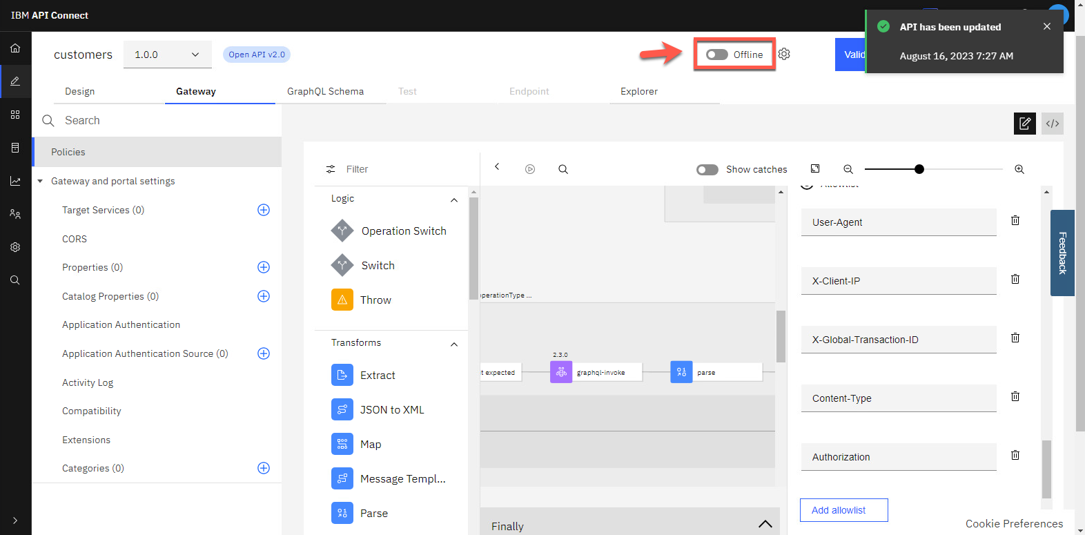 次に、API をテストしてみましょう。API を公開するには、ボタンをオフラインから オンラインに切り替えます。