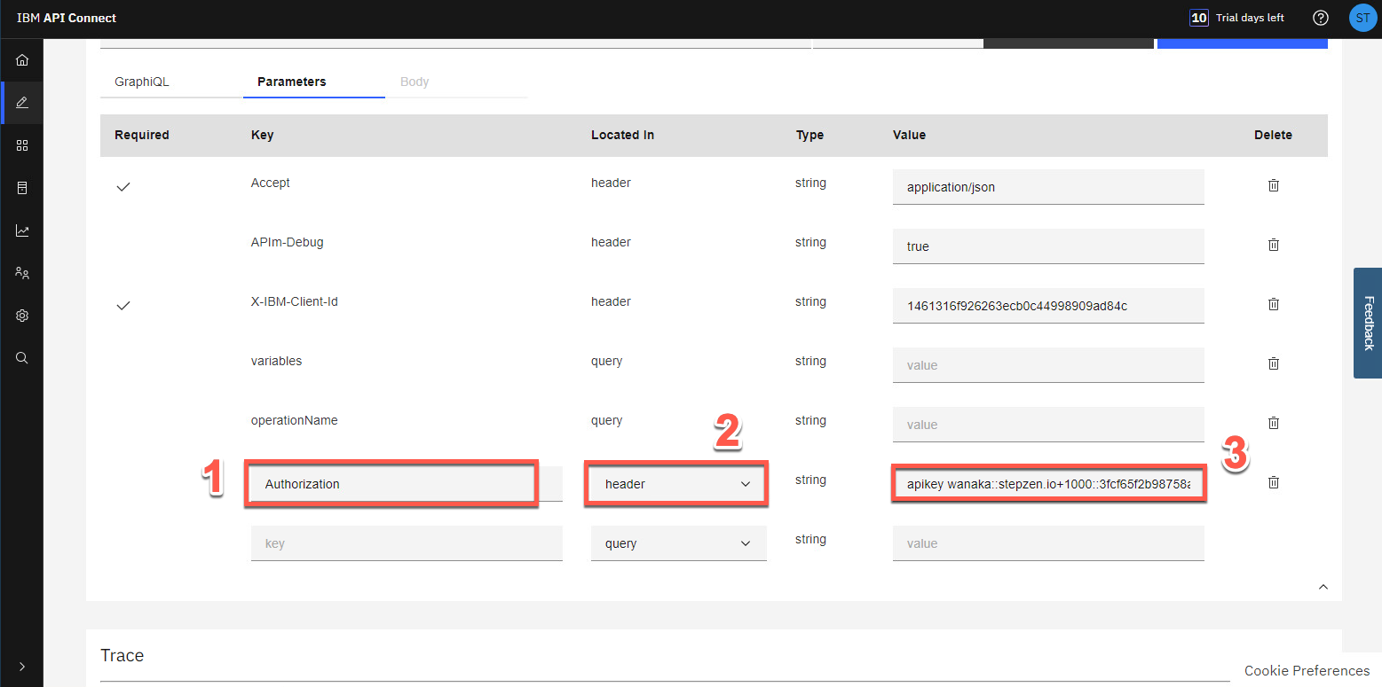 Value: [StepZen ダッシュボード ヘッダーからコピーした API キー値の貼り付け] (3)