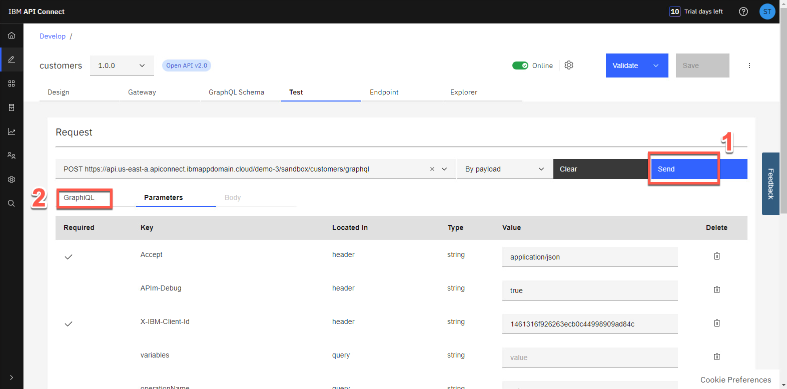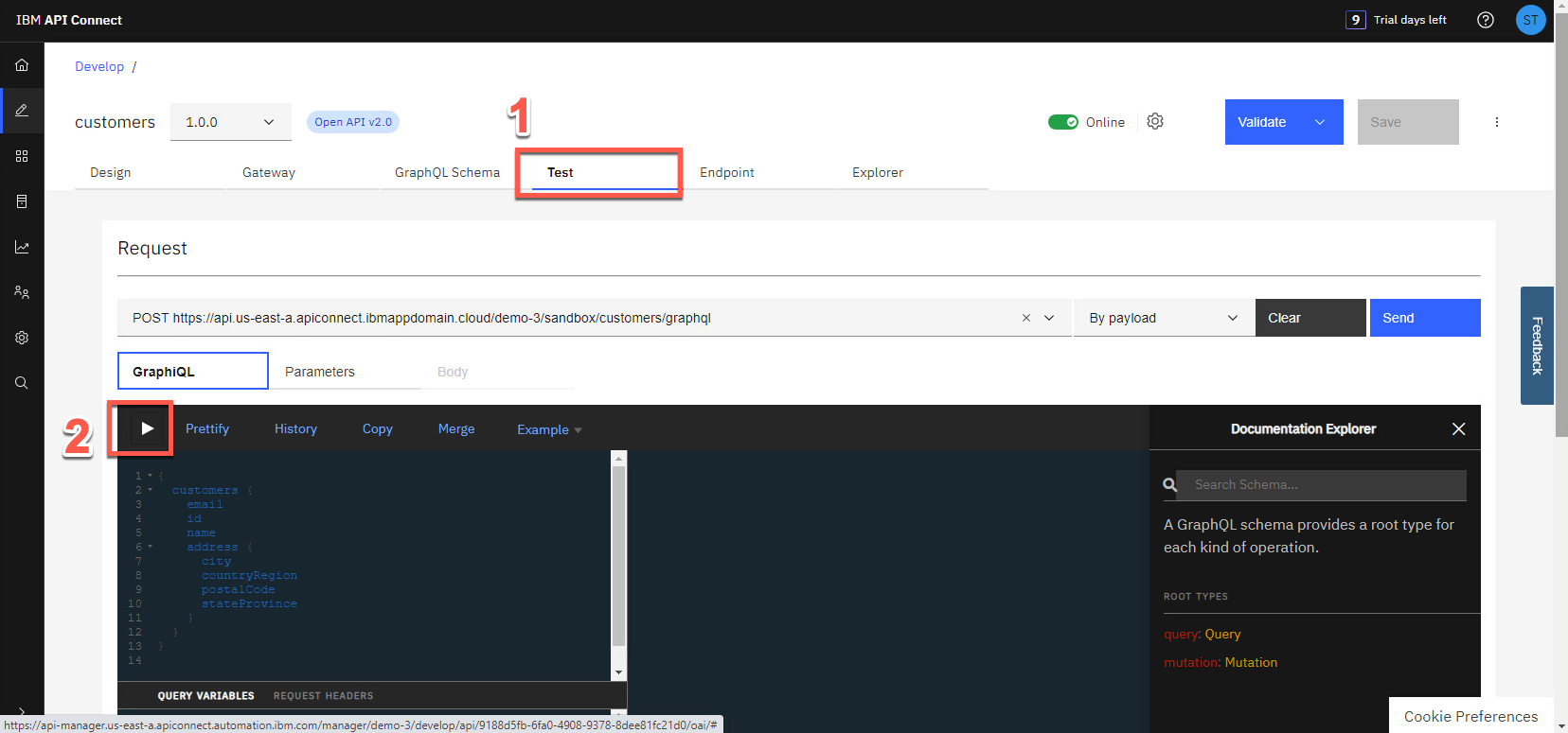 [送信] ボタン (1) をクリックし、[GraphiQL] タブ (2) を再度開いて結果を確認します。
