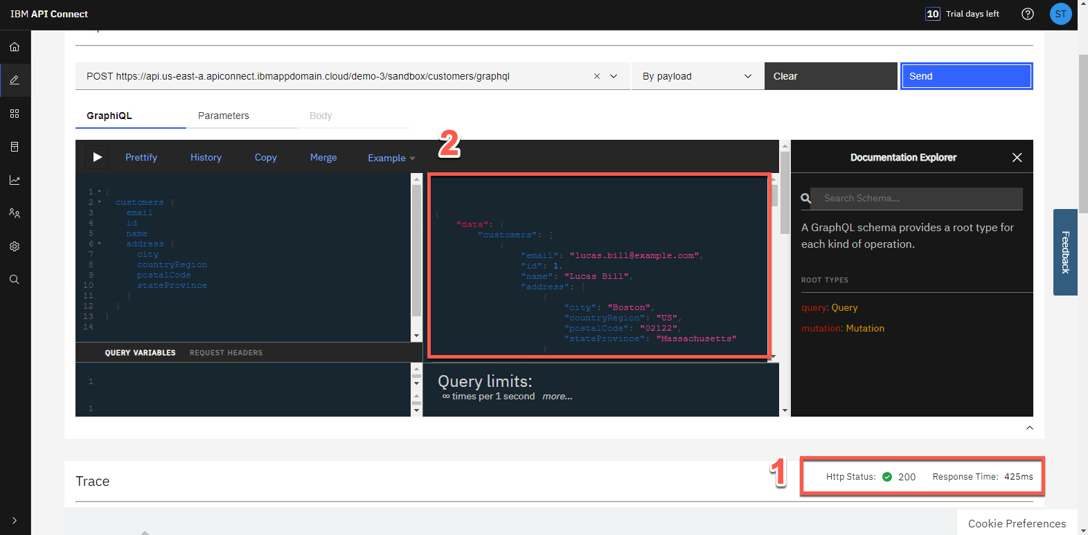 [Trace] セクションに HTTP ステータス: 200 (1) が表示され、応答データには GraphQL API から返されたデータが表示されます (2)。