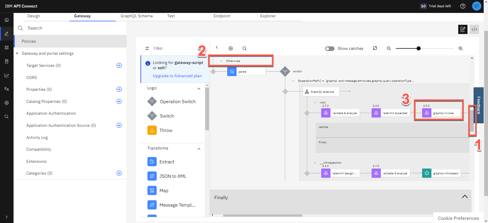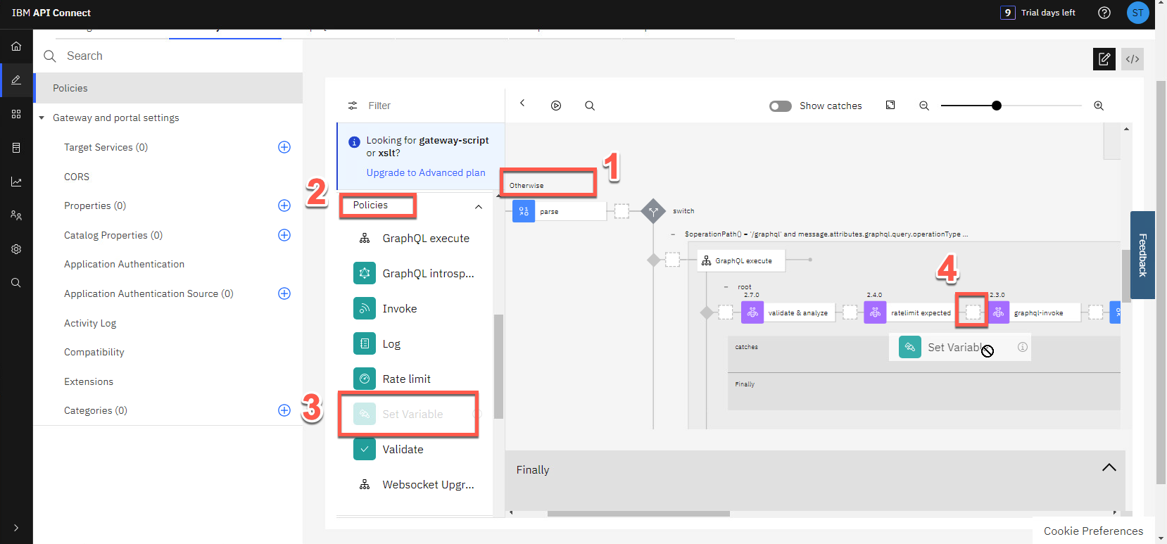 Parse で始まる Otherwise (1) で、graphql-invoke ノードの前にノードを追加します。パレット ビューで、下にスクロールして ポリシー セクション (2) を表示します。Set Variable (3) ノードを、「ratelimit Expected」ノードと「graphql-invoke」ノード (4) の間にドラッグ アンド ドロップします。