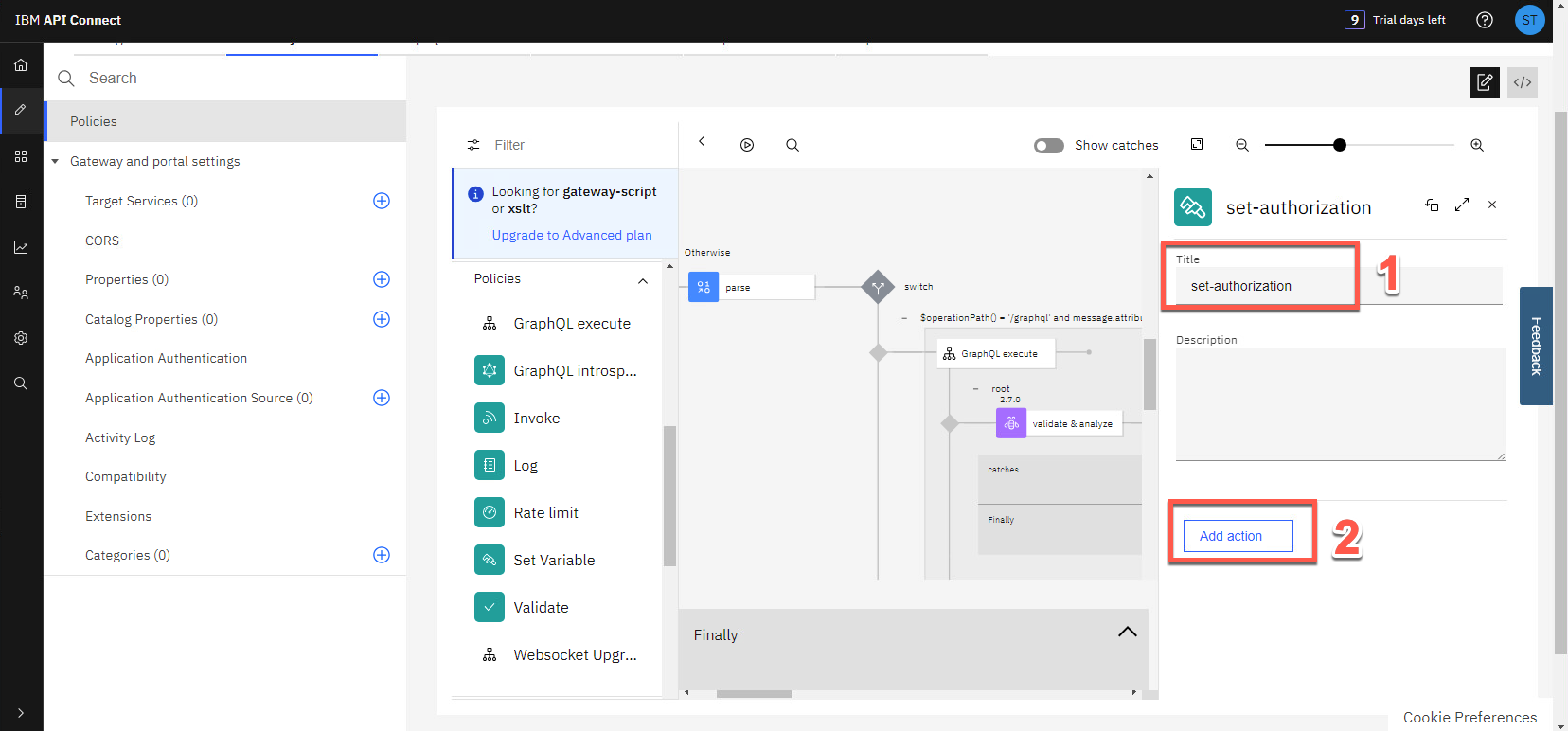 タイトルとして set-authorization と入力し (1)、アクションの追加 をクリックします (2)。