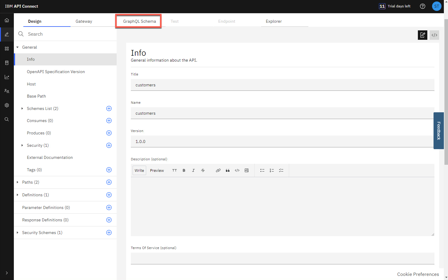 GraphQL API は、いくつかの追加オプションを備えた REST API と同じ構造になっています。REST API と同様に、左側のメニュー バーからセキュリティ スキーマ、パス、定義を追加できます。REST API と同様に、ゲートウェイ、テスト、エクスプローラー タブを表示することもできます。GraphQL API の新しいタブに気づくでしょう。[GraphQL スキーマ] タブをクリックしてスキーマを表示します。