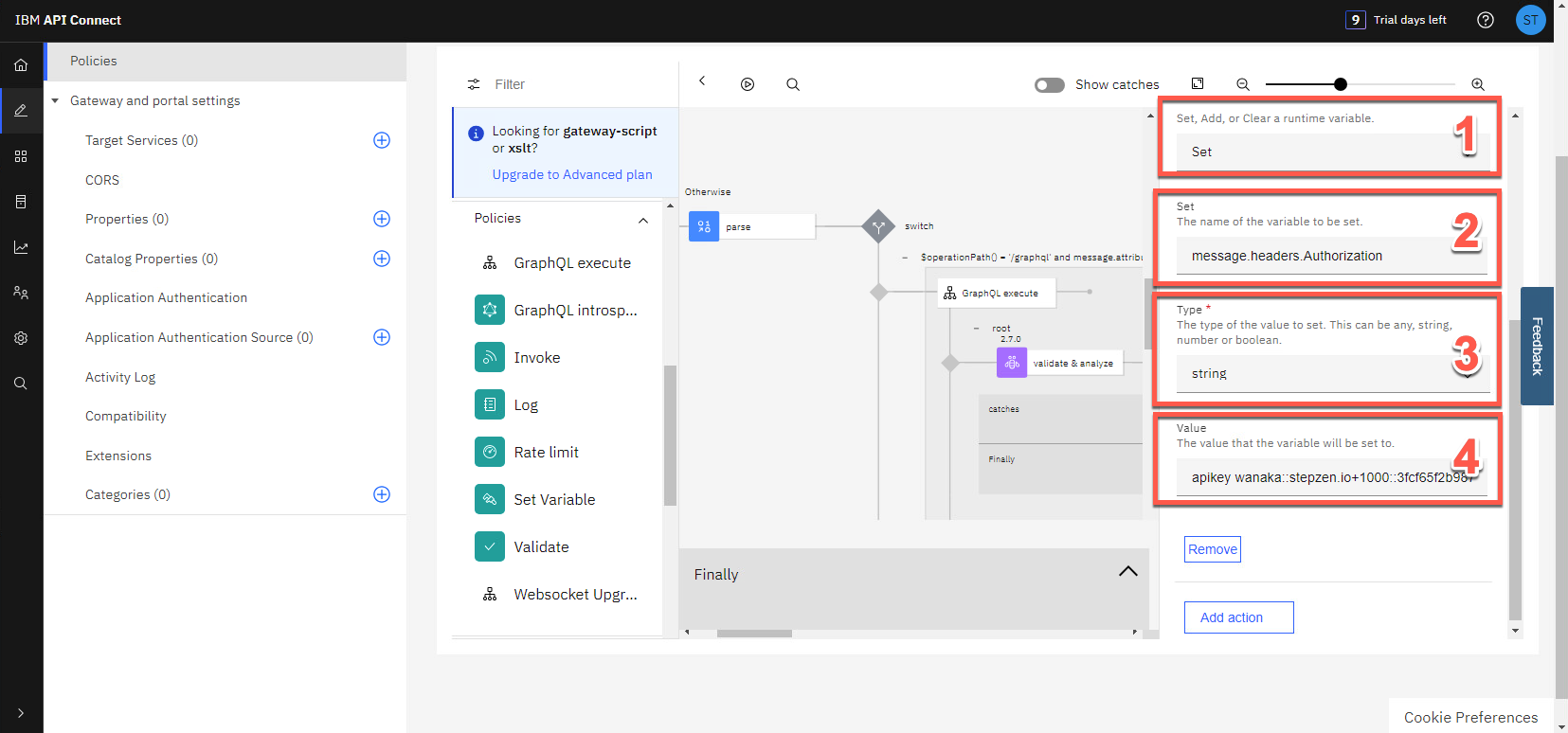 アクションのタイプとして Set (1) を選択します。「Set」フィールドに、設定する変数の名前として「message.headers.Authorization (2)」と入力します。設定する値のタイプとして string (3) を選択します。[Value] フィールドに、StepZen ダッシュボード ヘッダー* からコピーした *API キー値を貼り付けます (4)。