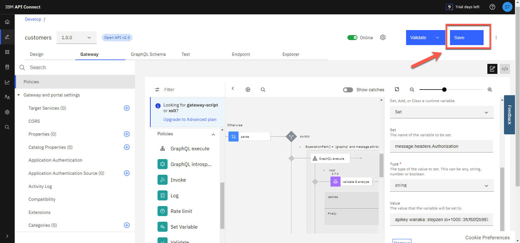 これは素晴らしいことですが、GraphQL API プロキシ フローで Authorization ヘッダー パラメーターをハードコーディングすることで簡素化できます。やりましょう![ゲートウェイ] タブを再度開きます。