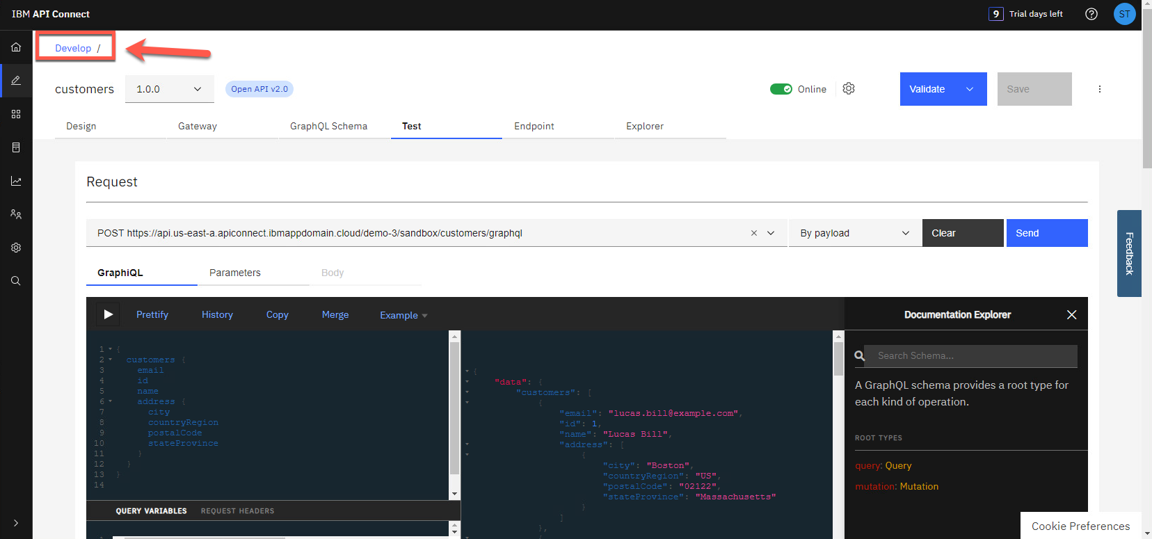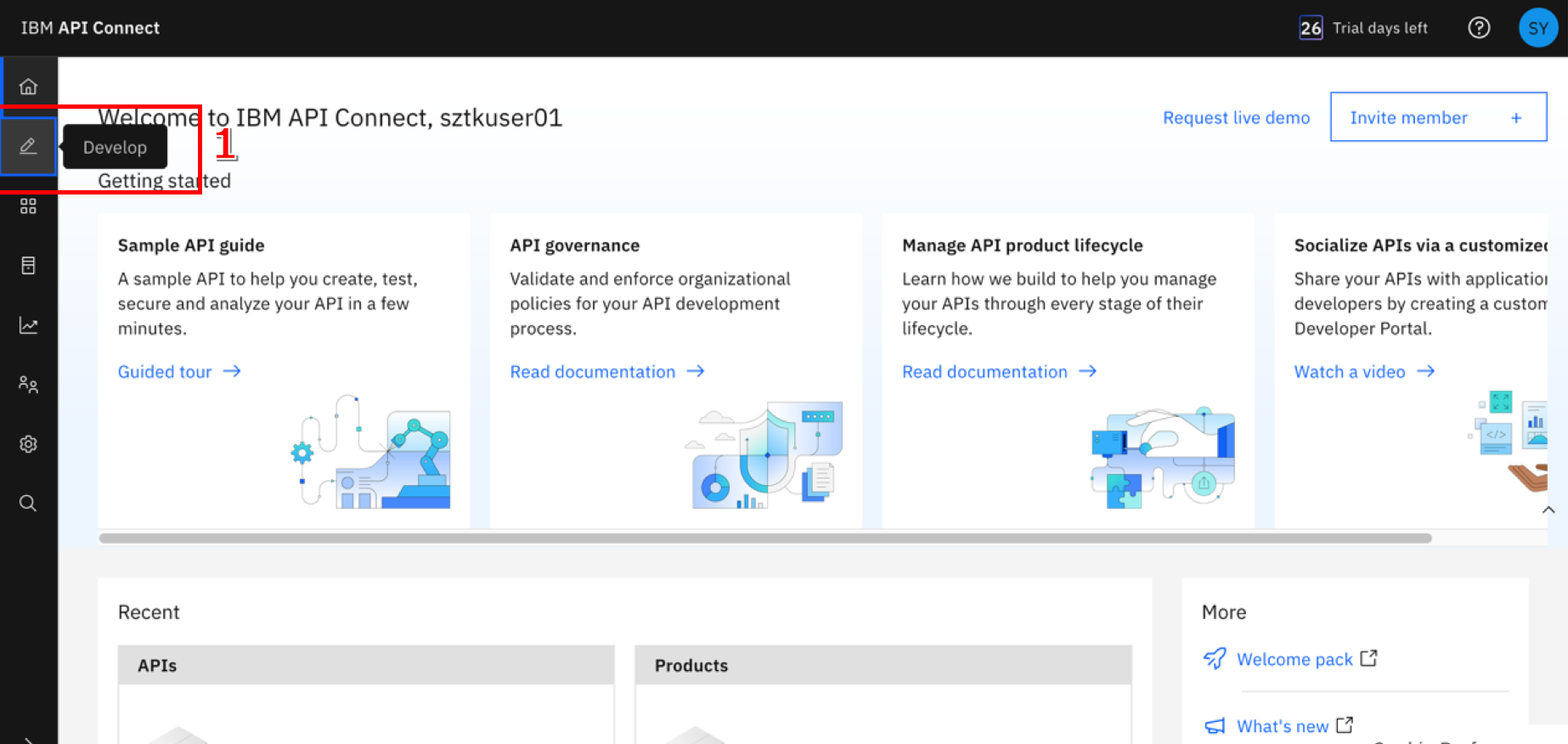 GraphQL プロキシ API を作成する方法を見てみましょう。ホーム ページ で、左端のアイコンの、Develop のアイコン (1) をクリックします。