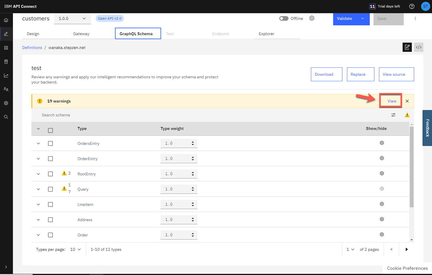 [GraphQL スキーマ] タブには、GraphQL スキーマ内のすべてのタイプと、各タイプのコストまたは費用のタイプの重み情報が表示されます。重み係数は、GraphQL API へのリクエストのタイプ コストを計算するときに使用されます。たとえば、値を取得するためにサーバー上で大量の CPU またはメモリを使用する必要があるフィールドには、より高いコストが割り当てられます。警告 メッセージで [表示] をクリックします。