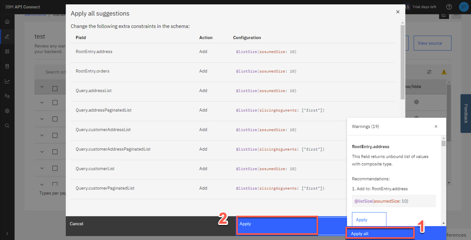 警告ウィンドウには、警告の詳細に加えて、制限を適用して警告を修正するオプションが表示されます。この人工知能は多くの場合非常に正確ですが、実際のシナリオでは、アプリケーションのセキュリティに影響を与えるため、結果を慎重に調べ、正確な場合にのみ受け入れることが重要です。この例では、すべて適用 (1) をクリックし、次に 適用 (2) をクリックします。