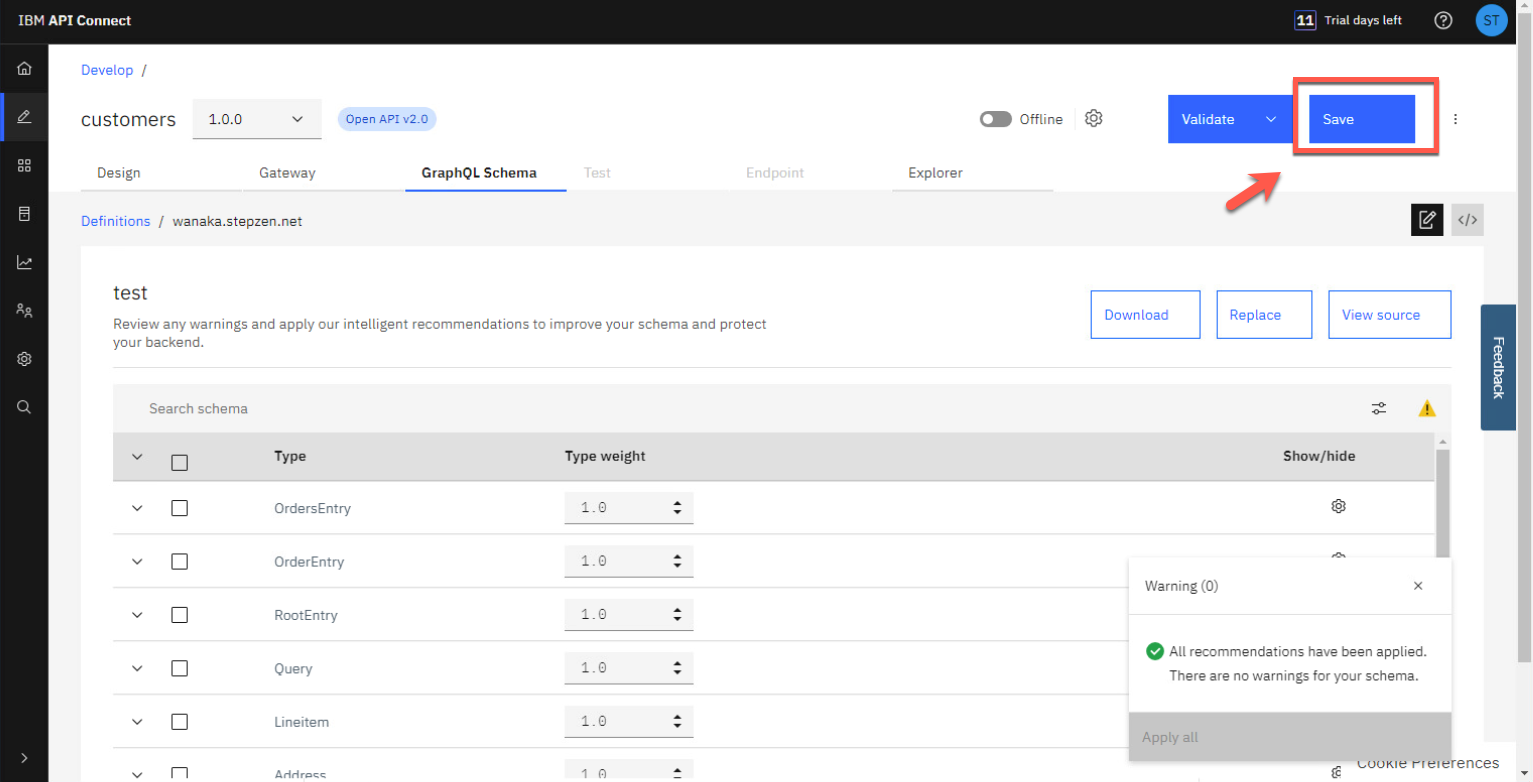 推奨事項を適用すると、警告メッセージが削除されます。[保存] をクリックして API 定義を保存します。