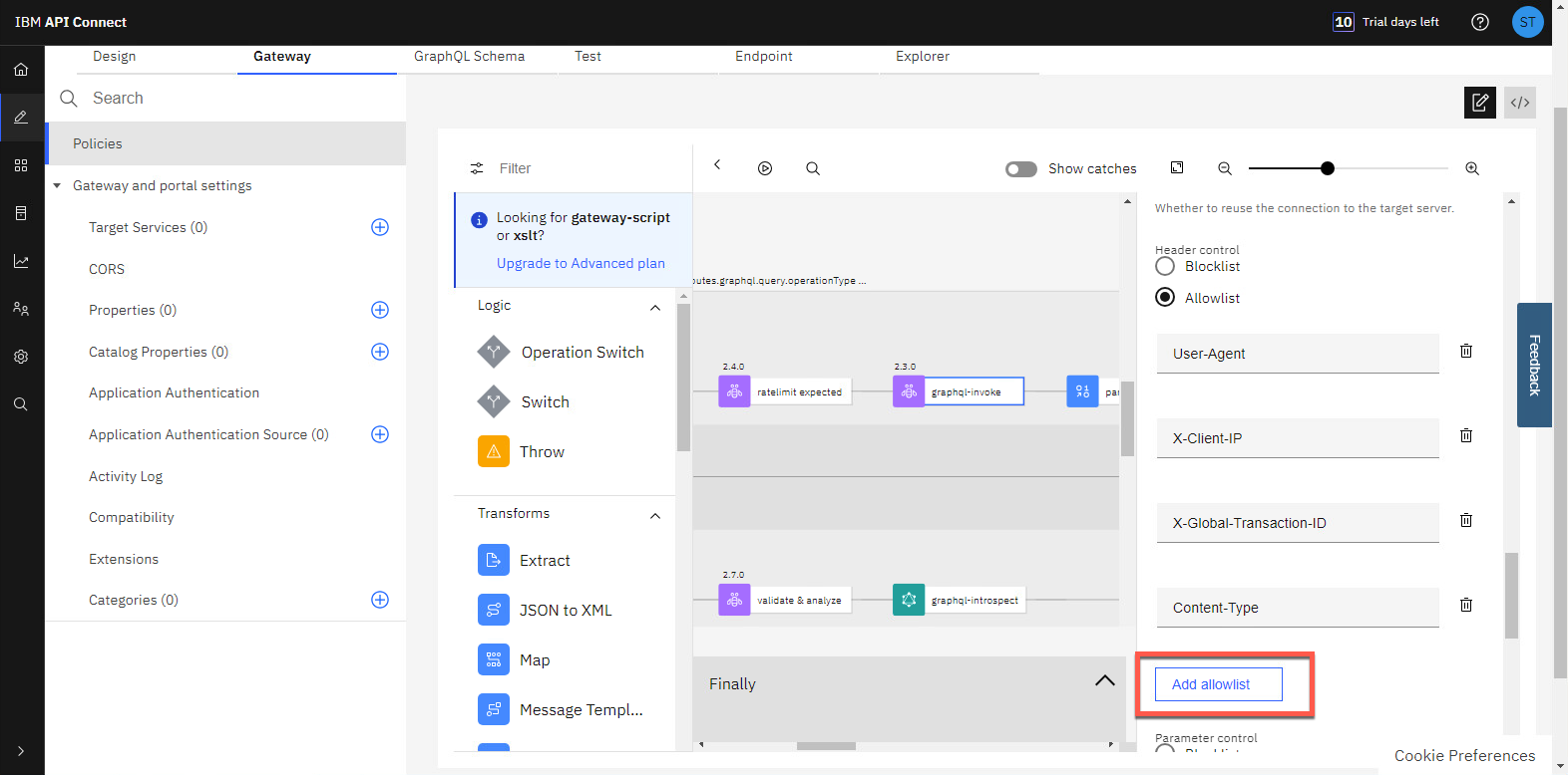 graphql-invoke ノード定義で、下にスクロールして Header control セクションを表示します。[許可リストの追加] をクリックして、リストに新しいヘッダーを追加します。
