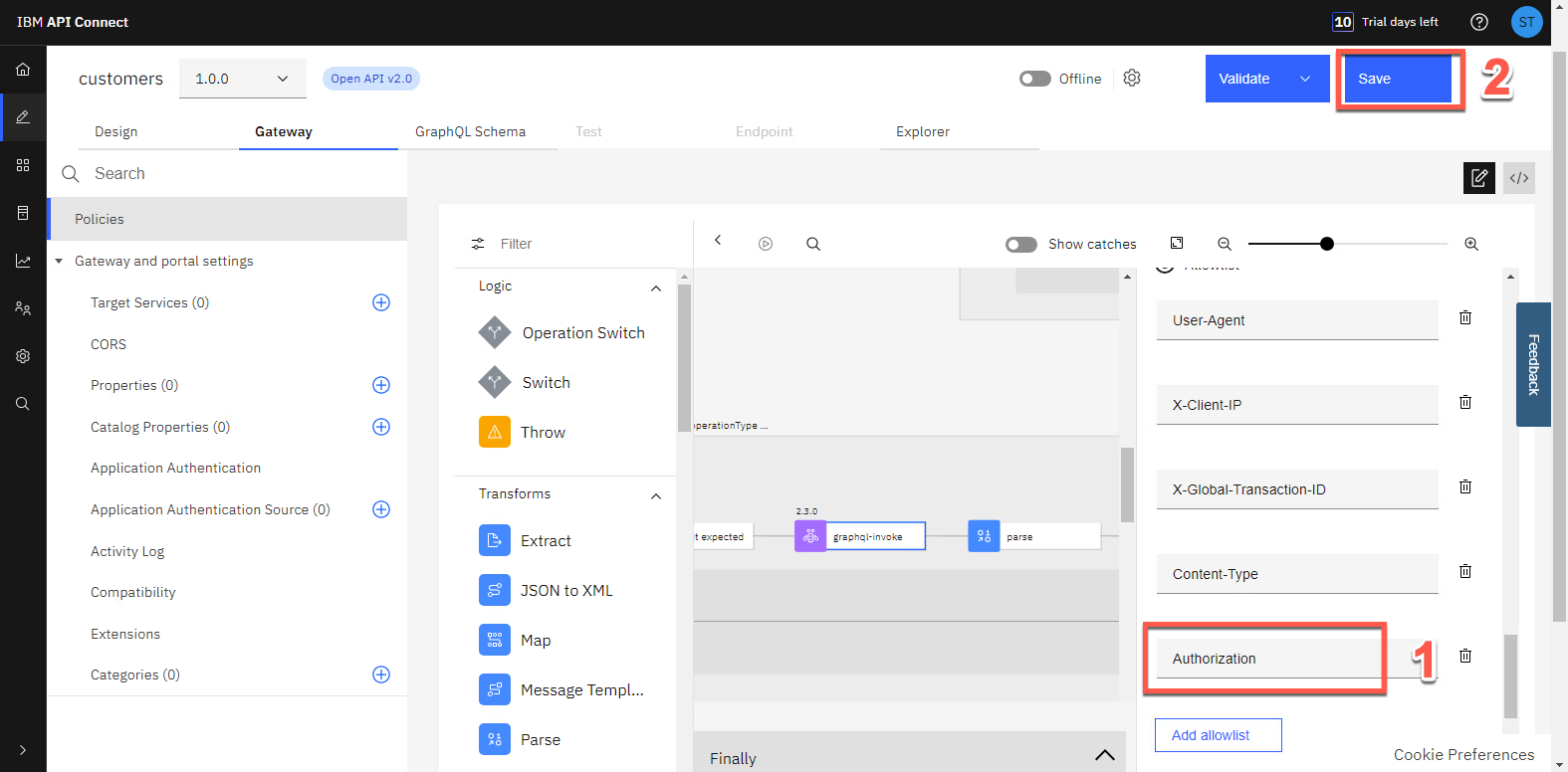 許可される新しいヘッダーとして Authorization と入力し (1)、保存 ボタンをクリックします (2)。これは、Authorization ヘッダーをバックエンドに送信することを意味します。