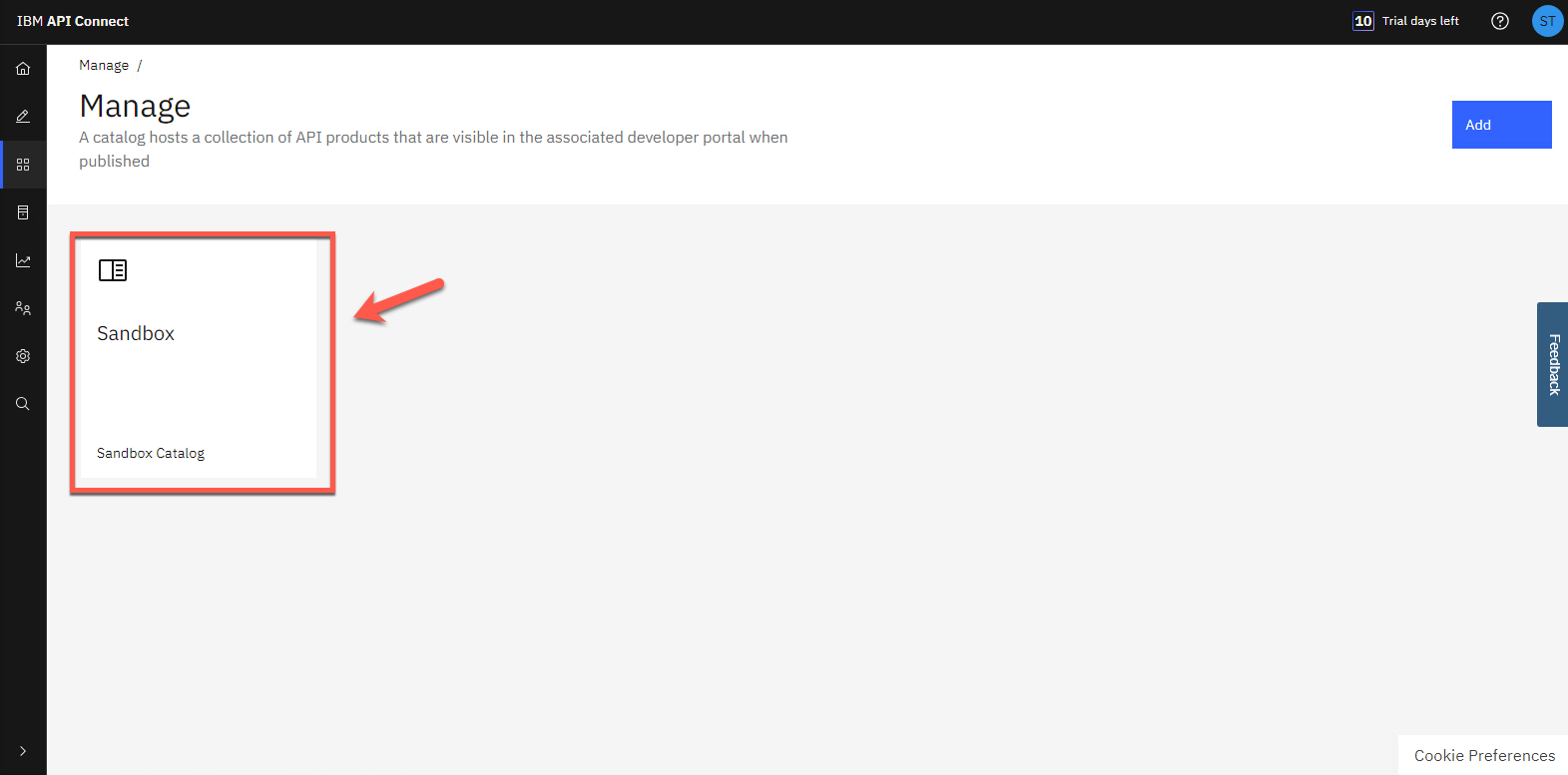 左側のメニューで、管理 アイコンをクリックして、サンドボックス カタログを管理します。