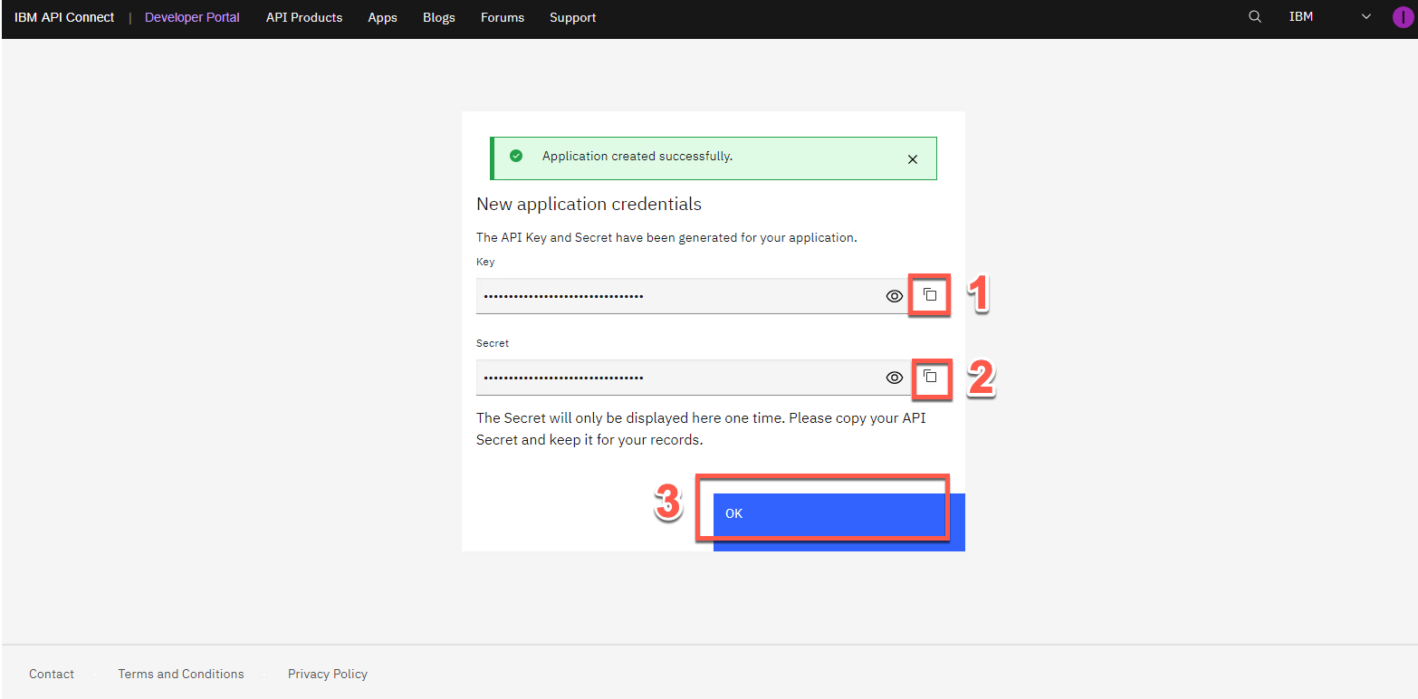 [認証情報] ダイアログ ボックスで、API キー (1)、API シークレット (2) をコピーし、OK (3) をクリックします。
