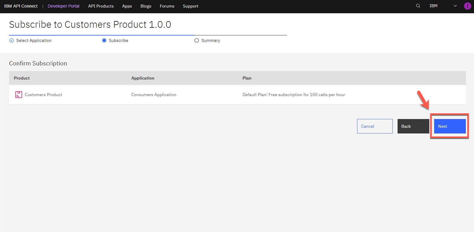 customers (1) を選択して、顧客 API を製品に追加します。次に、[次へ] (2) をクリックします。