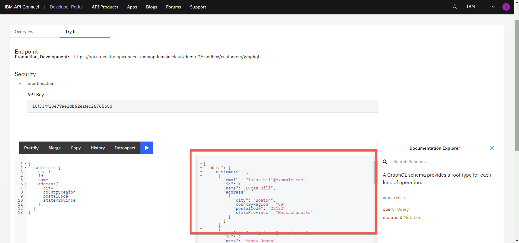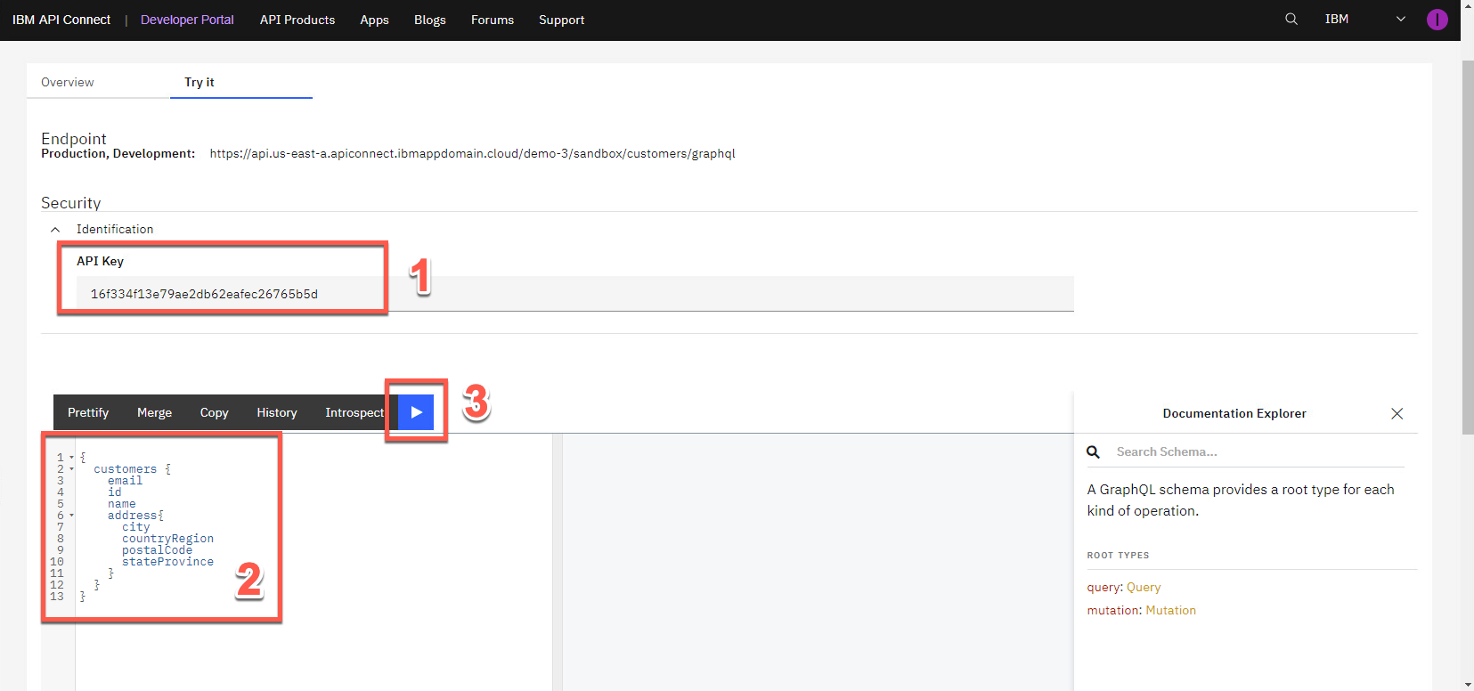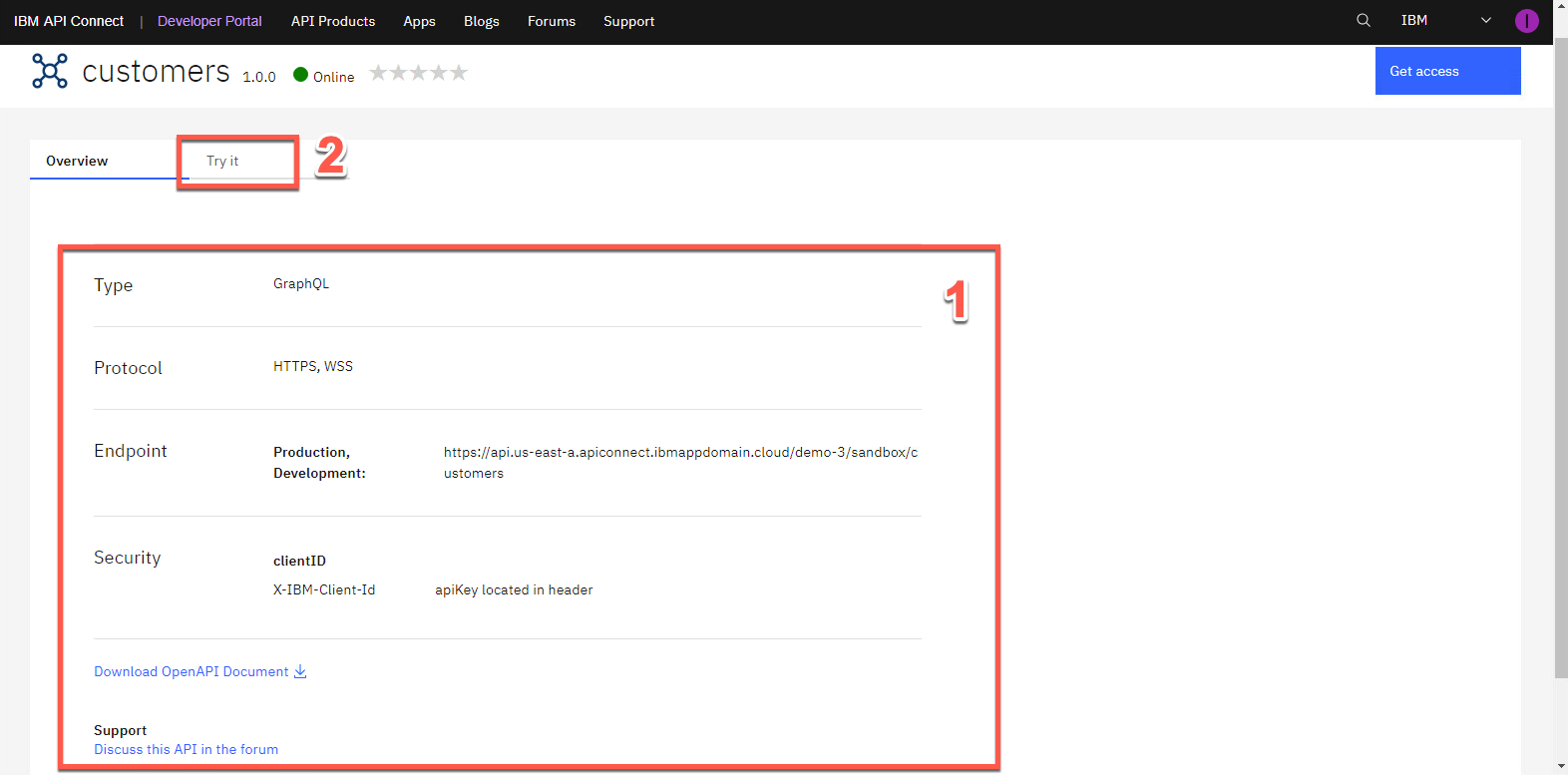 概要 ページから、OpenAPI ドキュメントをダウンロードし、API エンドポイントを取得できます。ポータルには、API を呼び出すために必要なものがすべて揃っていることに注意してください。[試してみる] タブを開きます。