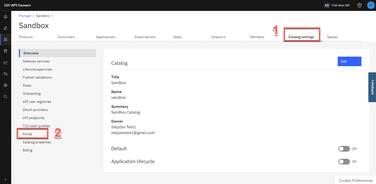 カタログ設定 をクリックし (1)、ポータル タブを開きます (2)。
