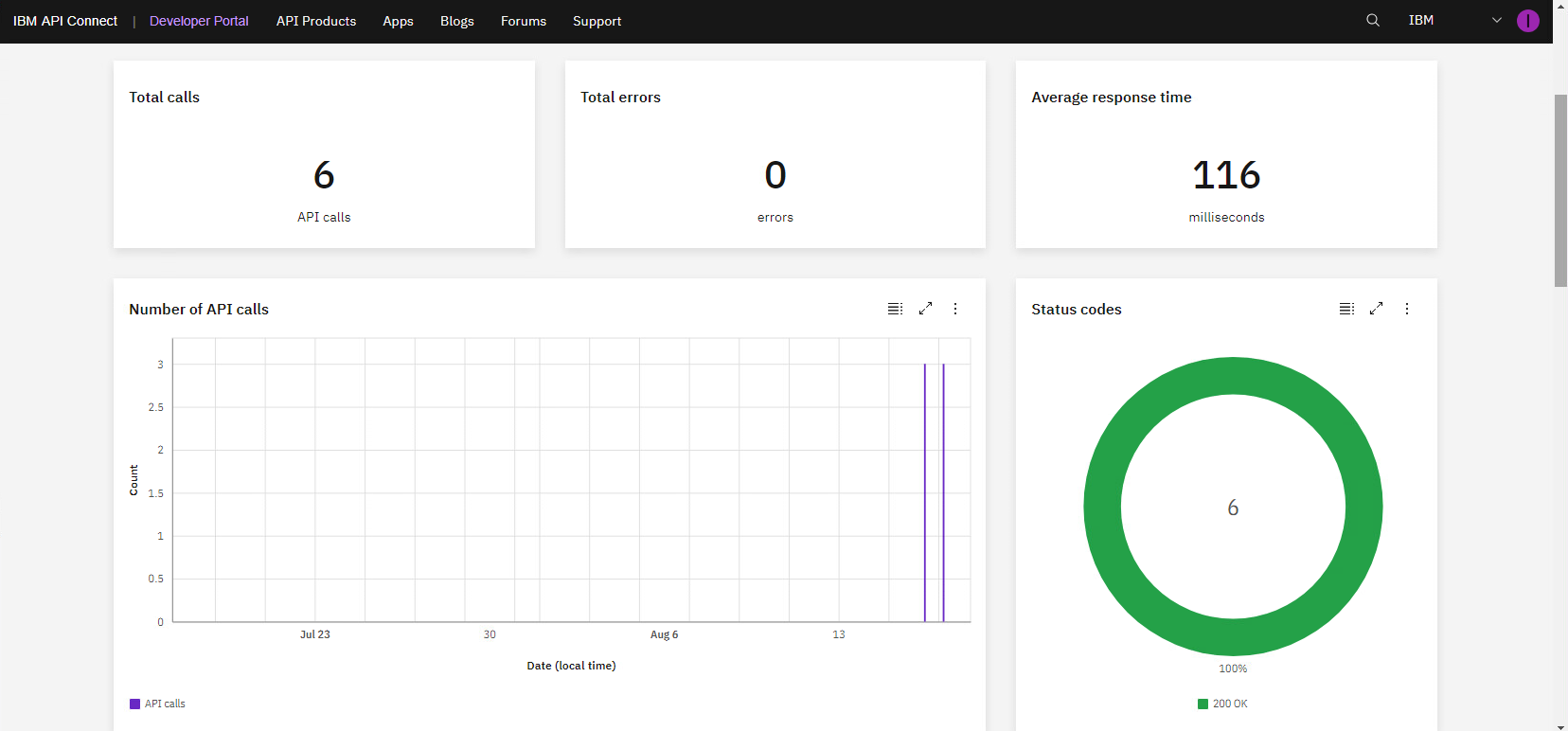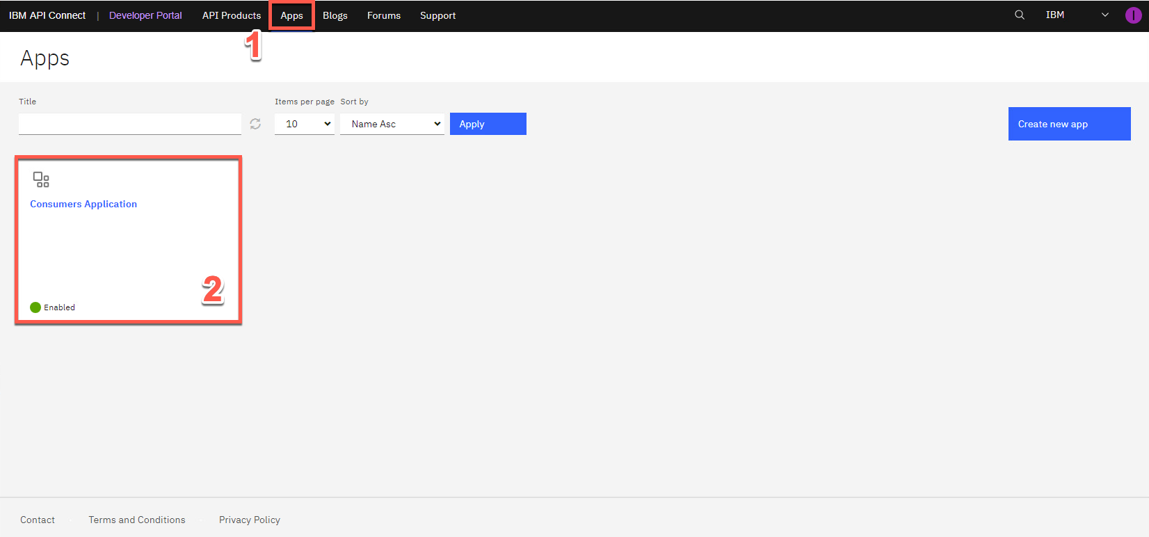 これは、API コンシューマ、つまり有料顧客としての経験でした。ここで、呼び出される API を使用する API プロバイダーとしてのエクスペリエンスに戻ります。アプリケーションの使用状況に関する分析情報が得られます。アプリ ページ (1) を開き、コンシューマ アプリケーション (2) を選択します。
