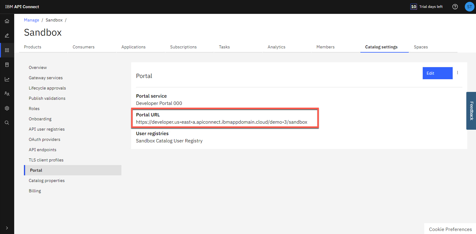 ポータルの URL を取得しましょう。管理 ページで、サンドボックス カタログを開きます。