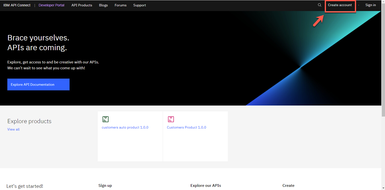 この開発者ポータルは公開 Web サイトであるため、柔軟性が高くカスタマイズ可能ですが、デフォルトのデザインを使用します。これらの次のステップはすべて、API コンシューマ、つまりエンドユーザー顧客が API を検索、購入、使用するために行うことをシミュレートしていることに注意してください。[アカウントの作成] をクリックして、新しい開発者アカウントを作成します。
