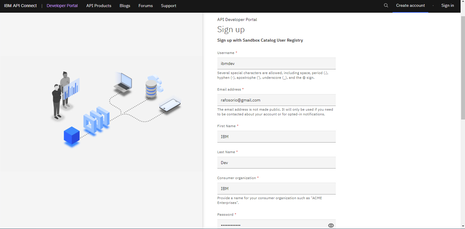 登録フォームに必要事項を記入し、個人の電子メールを使用してください。ユーザー名 (電子メールではない) とパスワードをメモしておきます。これらは、後で開発者ポータルにログインするために必要になります。