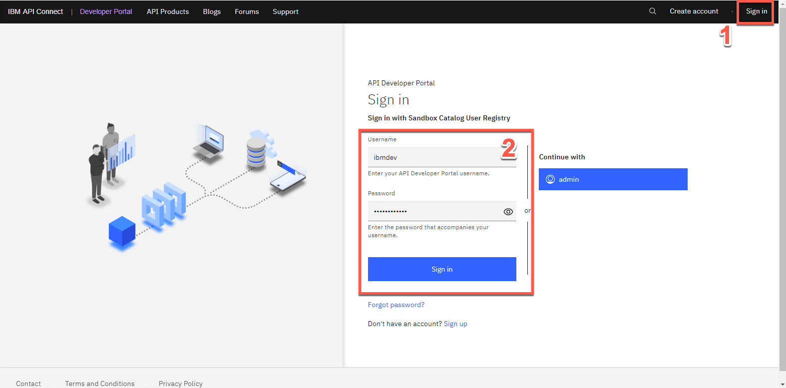 開発者の ユーザー名 と パスワード (2) を使用して、開発者ポータルに サインイン (1) します。