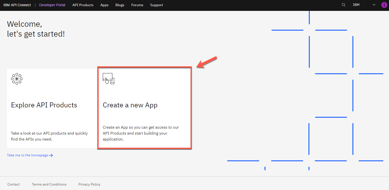 開発者ポータルには、現在公開されているすべての製品が表示されます。あなたの場合、アプリはまだ作成されていません。消費者/開発者として、ポータルで新しいアプリケーションを作成します。これにより API キーが得られ、API を呼び出すことができるようになります。[新しいアプリの作成] をクリックします。下記画面が表示されてない場合は、画面上部の[Apps] をクリックし、アプリケーション一覧画面を表示し [Create new App(新しいアプリの作成)] をクリックします。