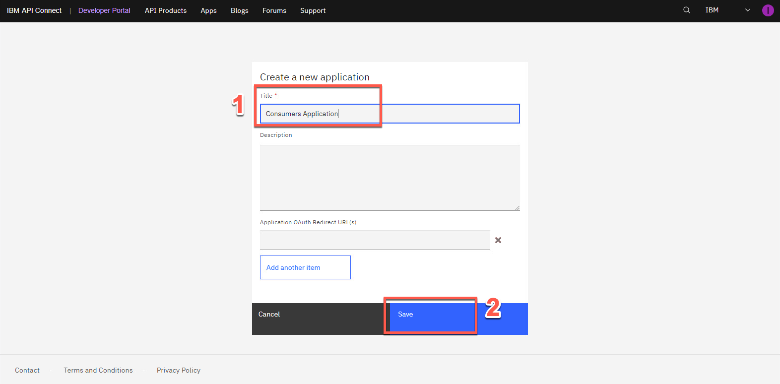 アプリのタイトルとして「Consumers Application」と入力します (1)。[保存] (2) をクリックします。