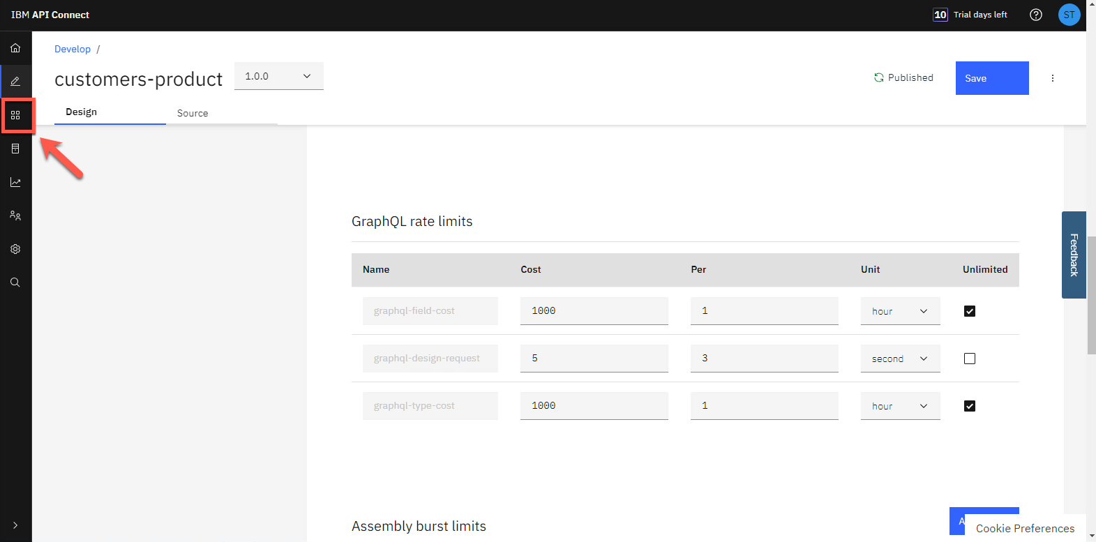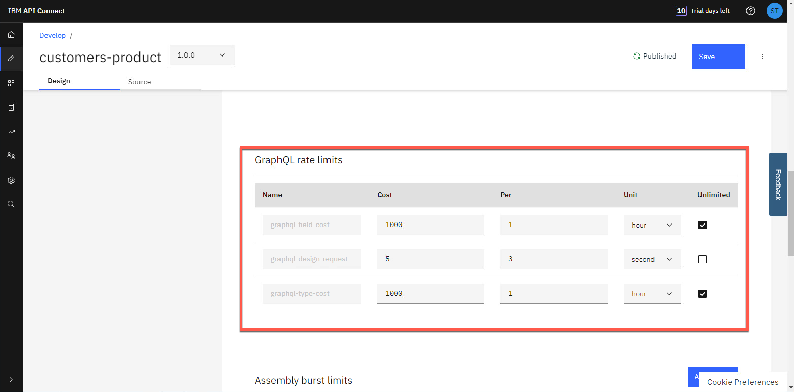 下にスクロールすると、GraphQL のレート制限が表示されます。このセクションから GraphQL のコスト パラメーターを調整できます (フィールドまたはタイプごとのコストを含む)。制限を設定することも、無制限にすることもできます。このチュートリアルでは、何も変更しません。