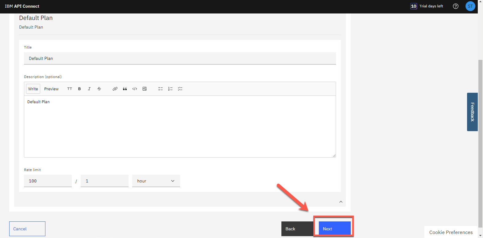 デフォルト プラン には従来のレート制限オプションが含まれていますが、次のステップで GraphQL レート制限をリストできるようになります。ここでは、[次へ] をクリックしてください。