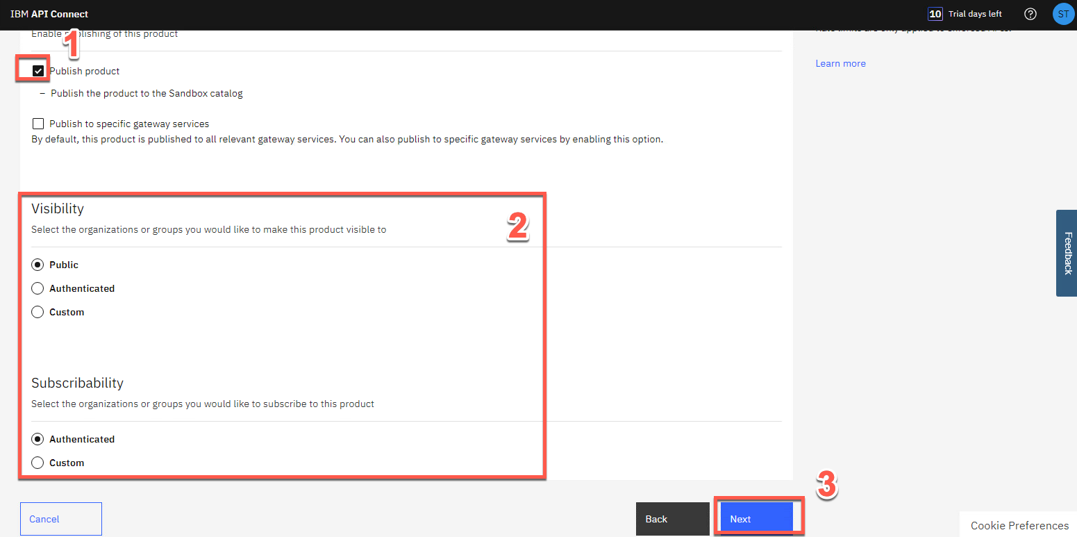 [製品の公開] (1) を選択して、製品をサンドボックス カタログに公開します。Visibility と Subscribability (2) のデフォルトを受け入れ、次へ (3) をクリックします。
