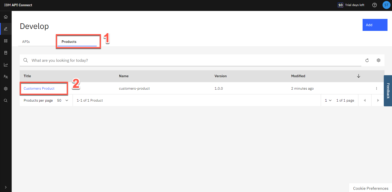 開発 ビューに戻り、製品 タブ (1) を開き、Customers Product (2) をクリックします。