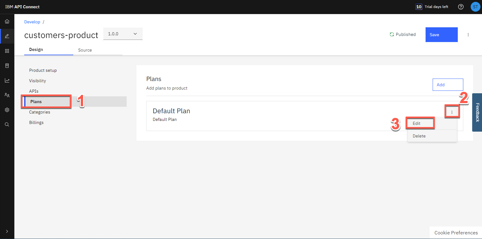 プラン セクションを開き (1)、デフォルト プラン で コンテキスト メニュー を開き (2)、編集 (3) を選択します。