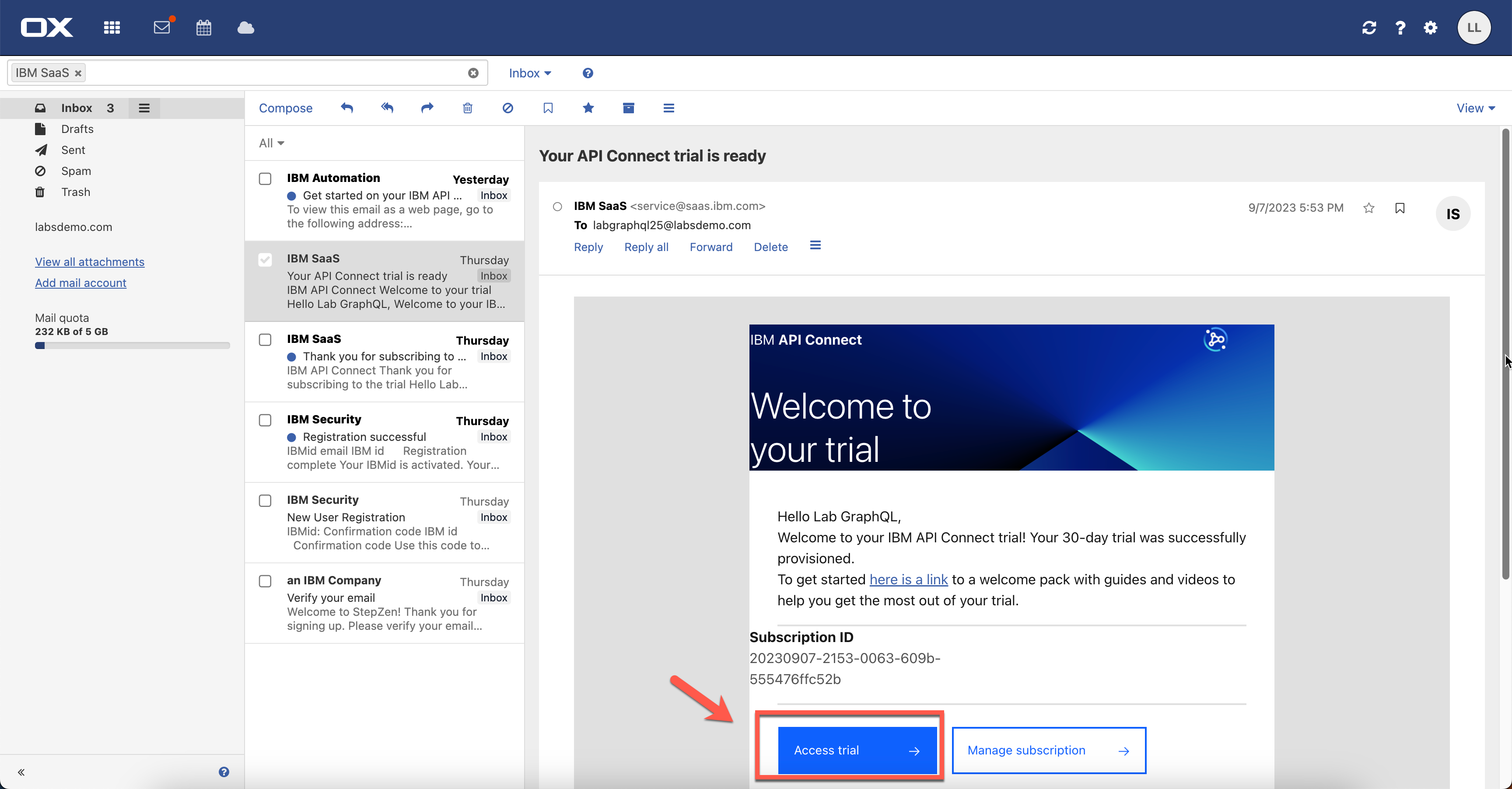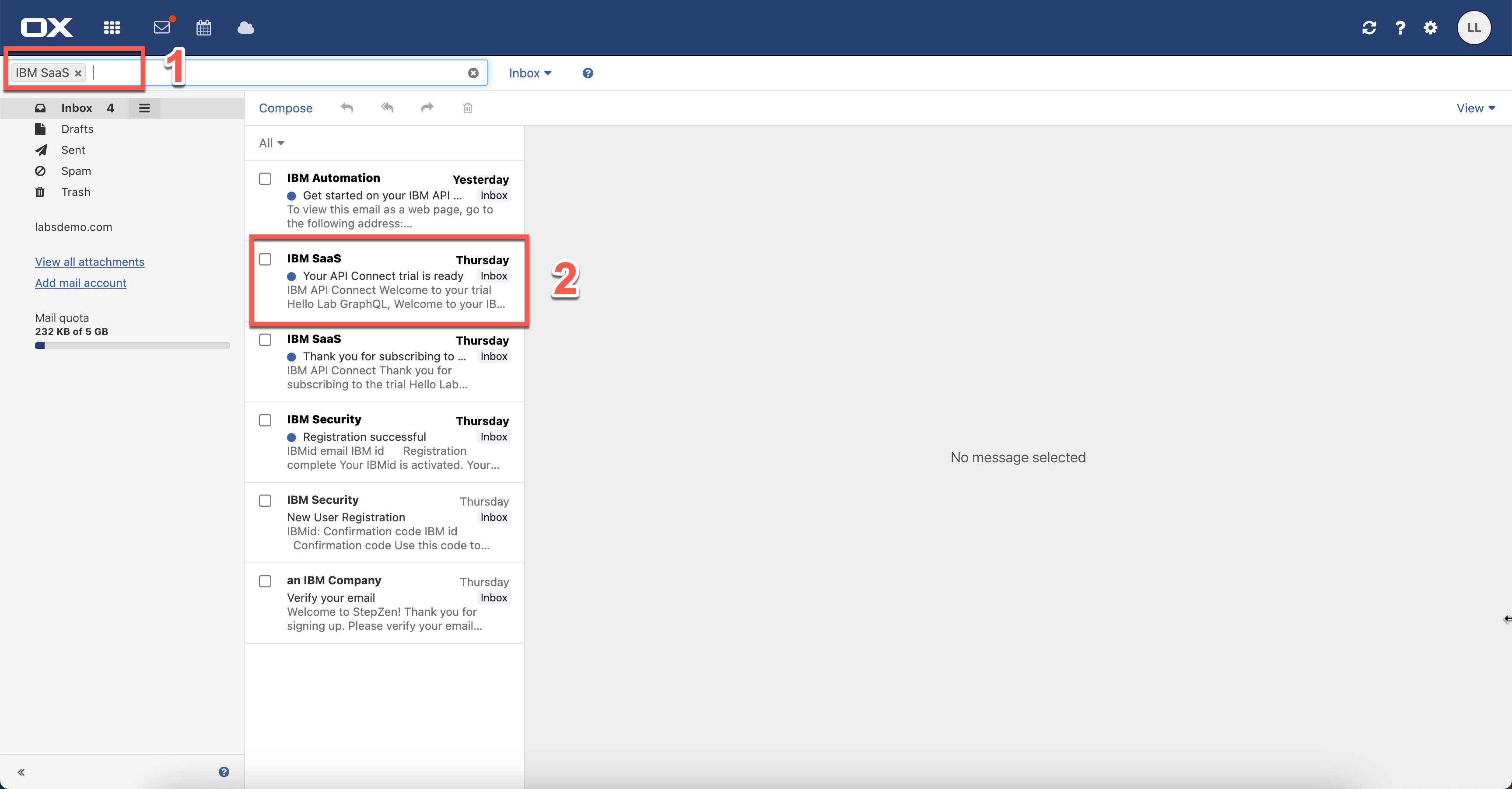 ラボ モニターからラボ アカウントを受け取った場合は、メールの受信トレイを開いて APIC 環境の URL を取得する必要があります。 。受信トレイ (ラボのユーザーとパスワードでログイン) で IBM SaaS を検索し (1)、「API Connect トライアルの準備ができました」電子メールを開きます (2)。