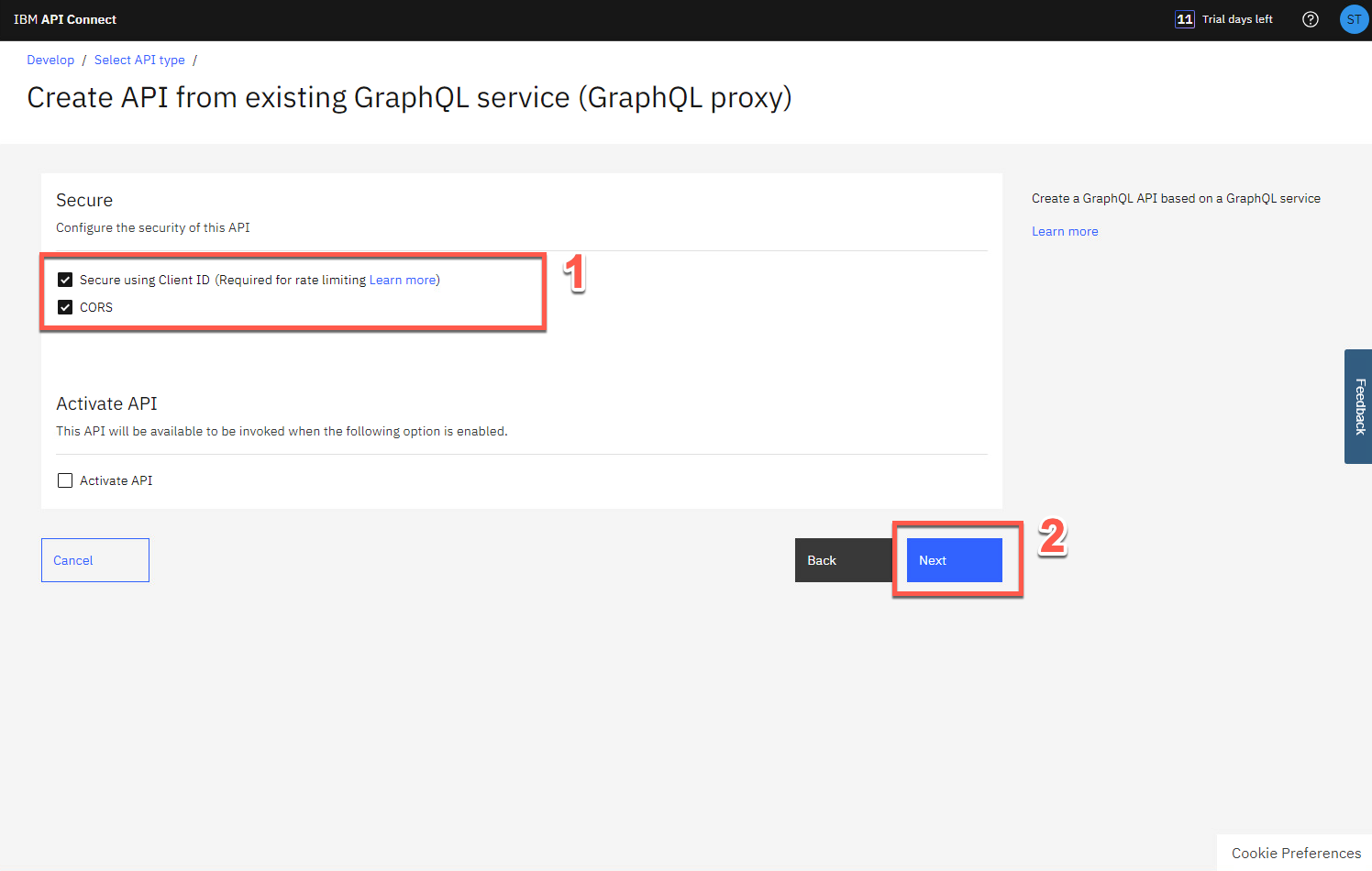 [クライアント ID を使用したセキュリティ保護] と [CORS] の両方をオンのままにして (1)、[次へ] をクリックします (2)。