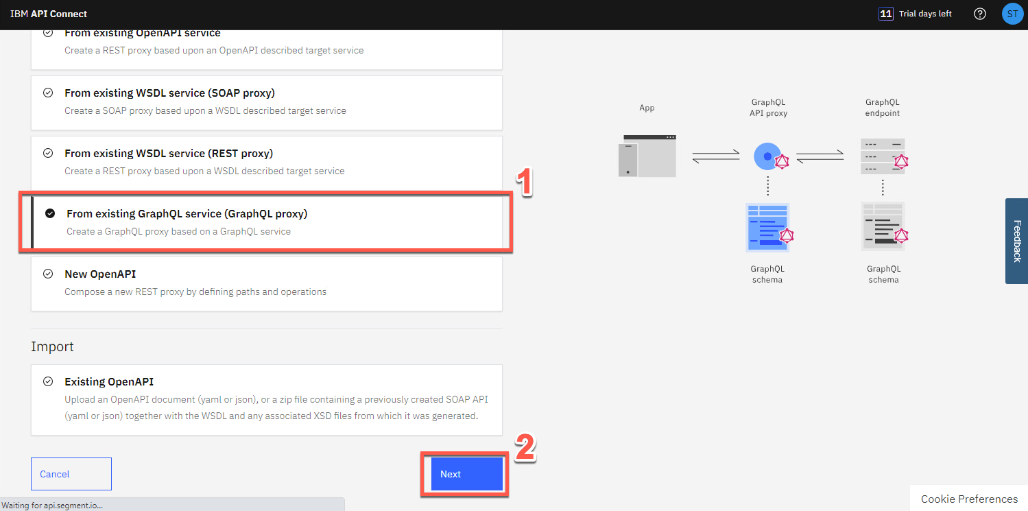 GraphQL プロキシを作成するには、「API タイプの選択」画面で、OpenAPI 2.0(デフォルト)を選択し、既存の GraphQL サービス (GraphQL プロキシ) から (1) を選択します。既存の GraphQL サーバーを指定すると、API Connect はサービスをイントロスペクトし、GraphQL プロキシ サービスを自動的に作成します。次に、[次へ] (2) をクリックします。