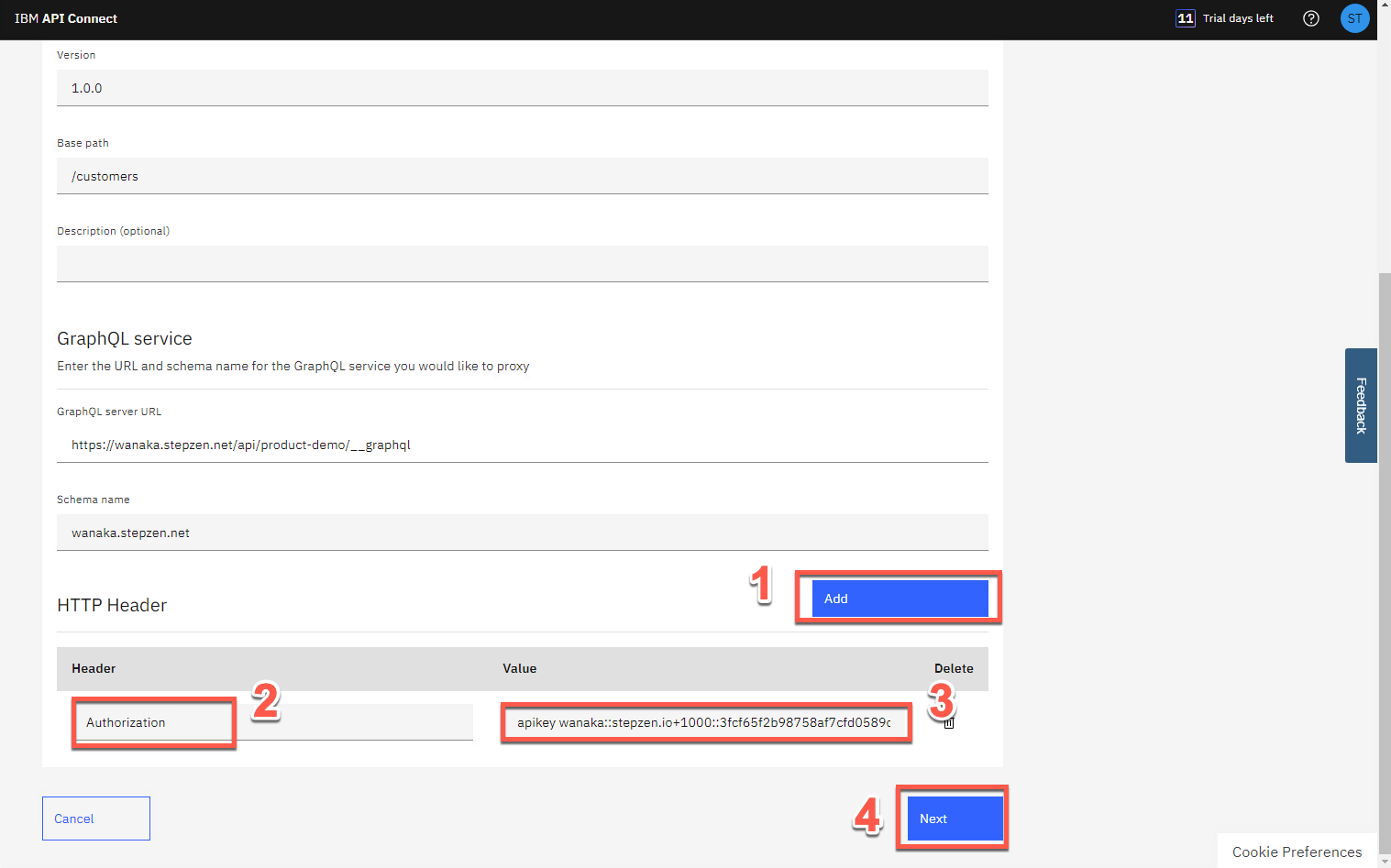 HTTP ヘッダー セクションで、Add (1) をクリックして Header として Authorization (2) を入力し、StepZen Dashboard ヘッダー セクションからコピーした API キー値 をValueフィールドに貼り付けます(3)。次に、[次へ] (4) をクリックします。