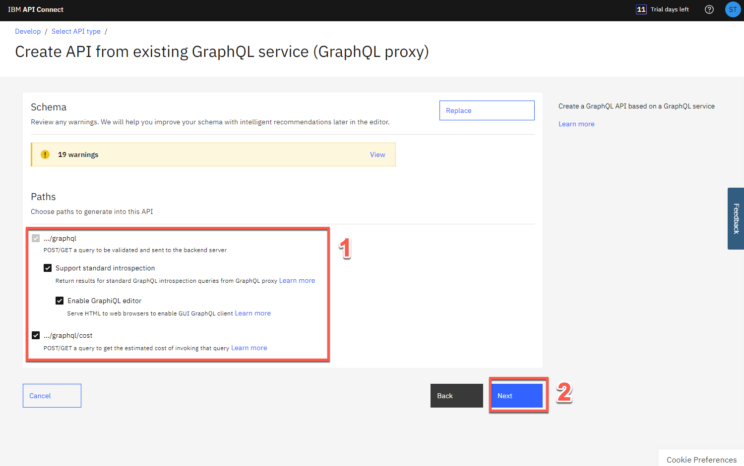 スキーマ検証ツールは、警告とエラーが見つかった場合に報告します。ここではスキーマ警告を無視してください。この警告は後の手順で修正されます。[Paths] セクションで、使用可能なエンドポイントを すべて 選択し (1)、次へ をクリックします (2)。