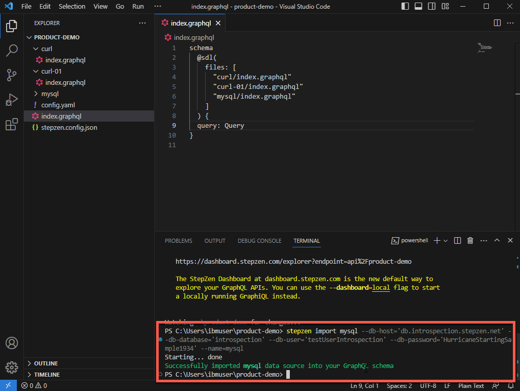 stepzen import mysql --db-host='db.introspection.stepzen.net' --db-database='introspection' --db-user='testUserIntrospection' --db-password='HurricaneStartingSample1934' --name=mysql