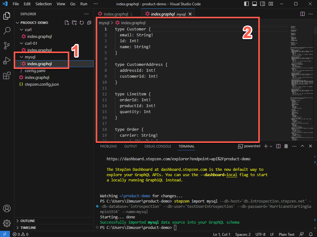 3 番目のスキーマである product-demo フォルダー内の index.graphql ファイルを開き (1)、このスキーマが他の 2 つのスキーマを参照していることを確認します (2)。