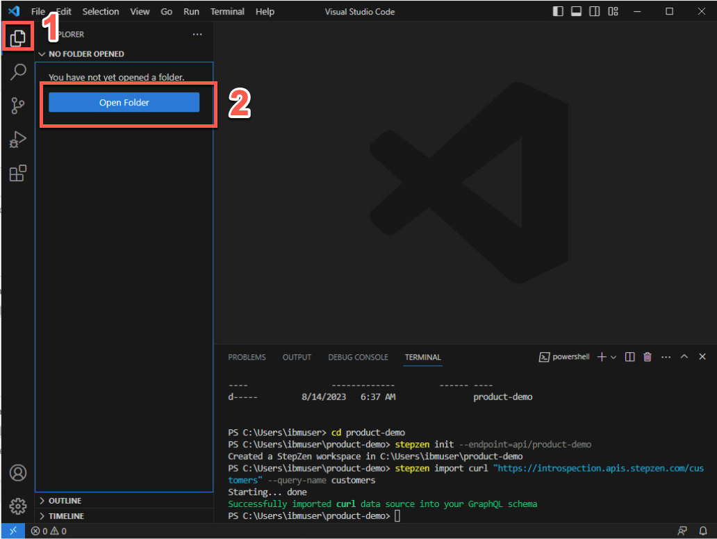 成功しました。最初の GraphQL API が作成されました。graphQL スキーマを調べてみましょう。Visual Studio Code で、エクスプローラー アイコン (1) をクリックし、フォルダーを開く (2) をクリックします。