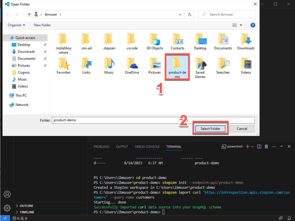 新しく作成した product-demo フォルダー (1) を選択し、フォルダーの選択 をクリックします (2)。