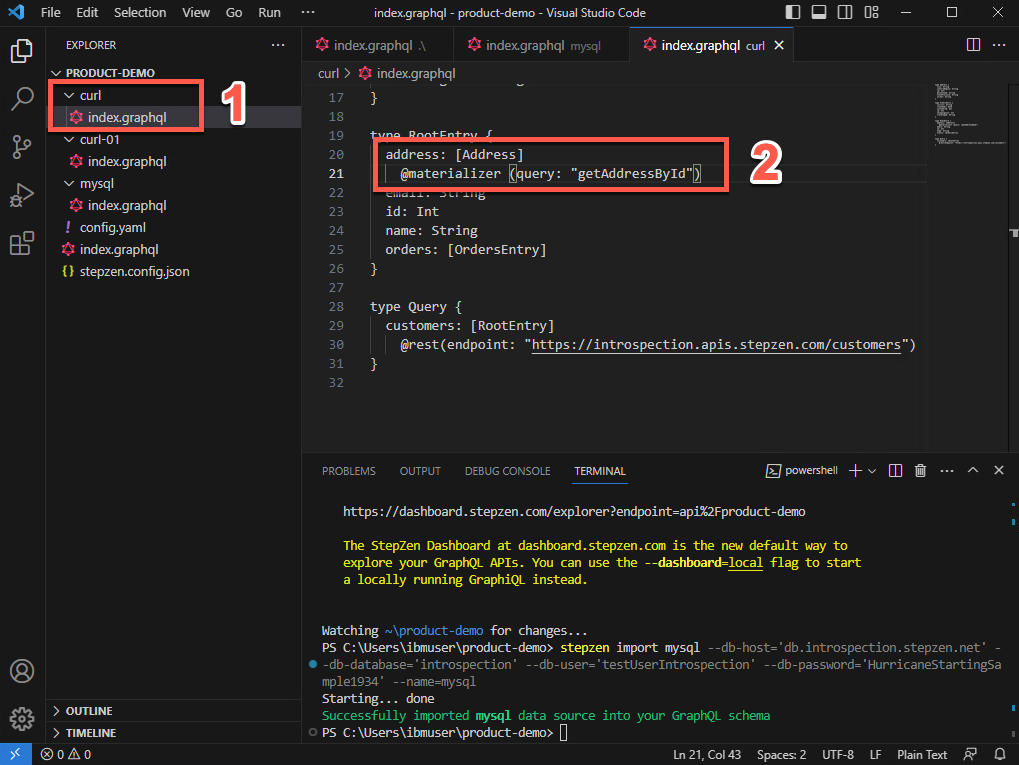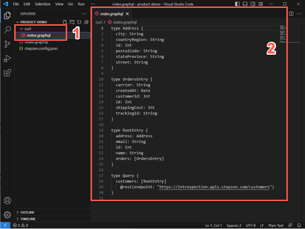 GraphQL スキーマを確認するには、curl フォルダーを開き、index.graphql ファイルを選択します (1)。index.graphQL ファイル (2) を探索して確認してください。