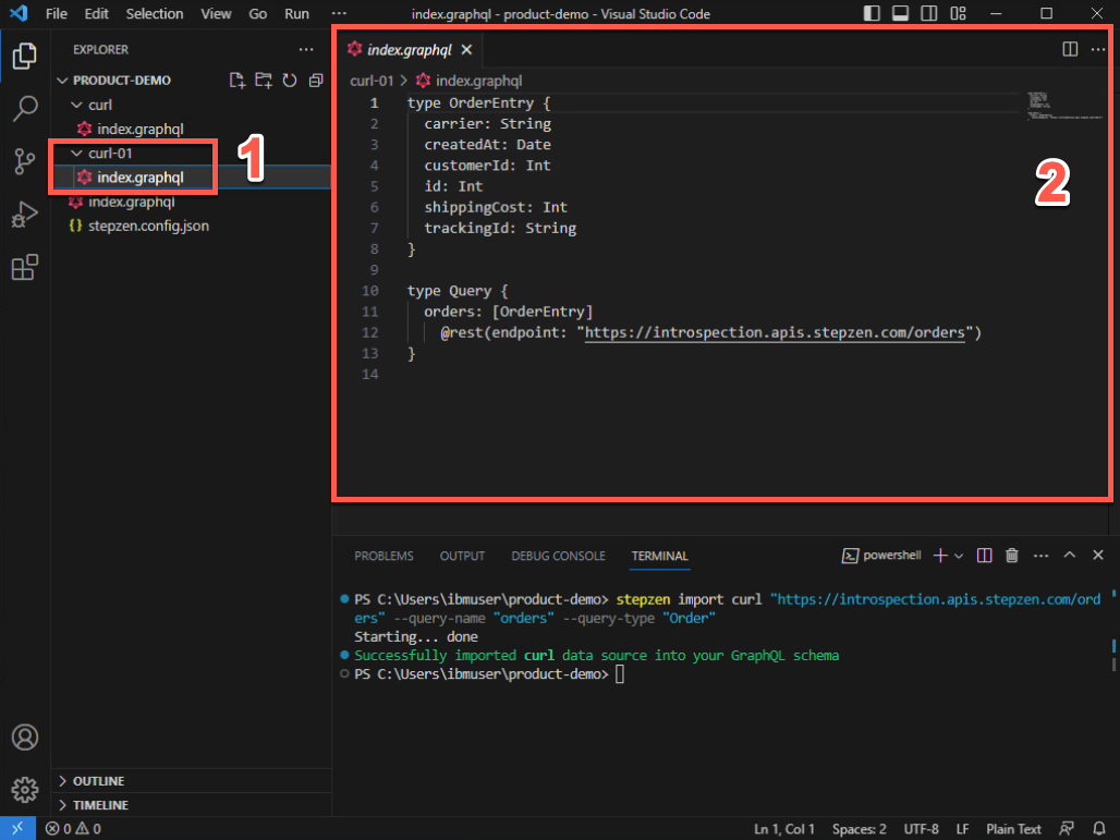 新しいgraphQLスキーマを確認するには、curl-01フォルダーを開き、新しいindex.graphqlファイルを開きます(1)。新しいスキーマ (2) を確認してください。