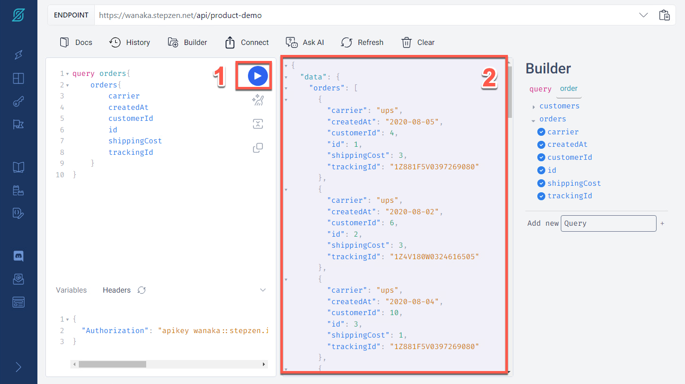 StepZen Dahsboard では、さまざまなクエリを操作できます。[クエリの実行] ボタン (1) をクリックして注文クエリをテストします。結果データ(2)を確認します。