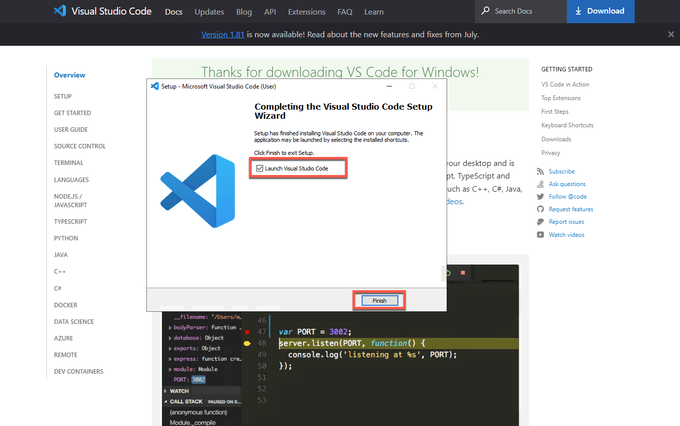 最後に、Visual Studio Code を起動する オプションをオンにして、完了 をクリックします。