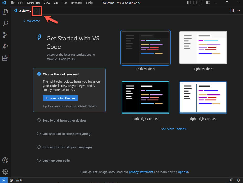 [ようこそ] タブを閉じます。