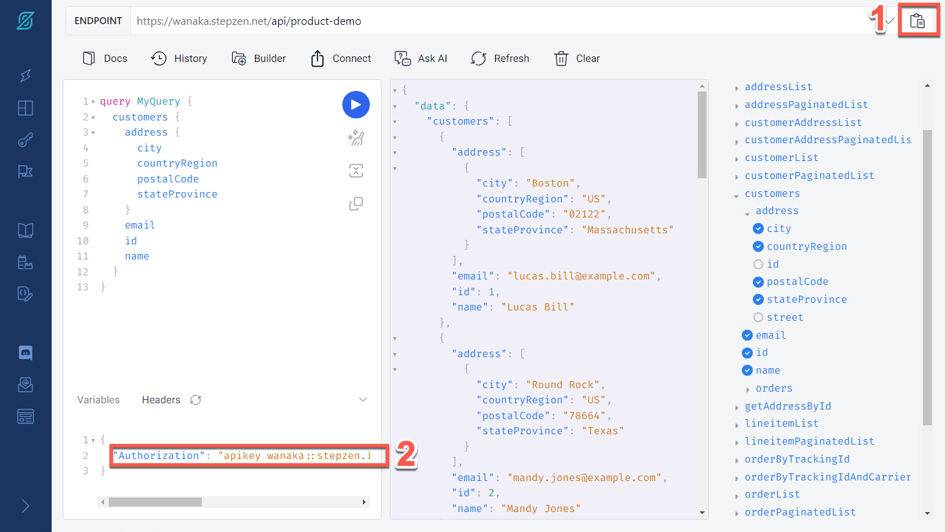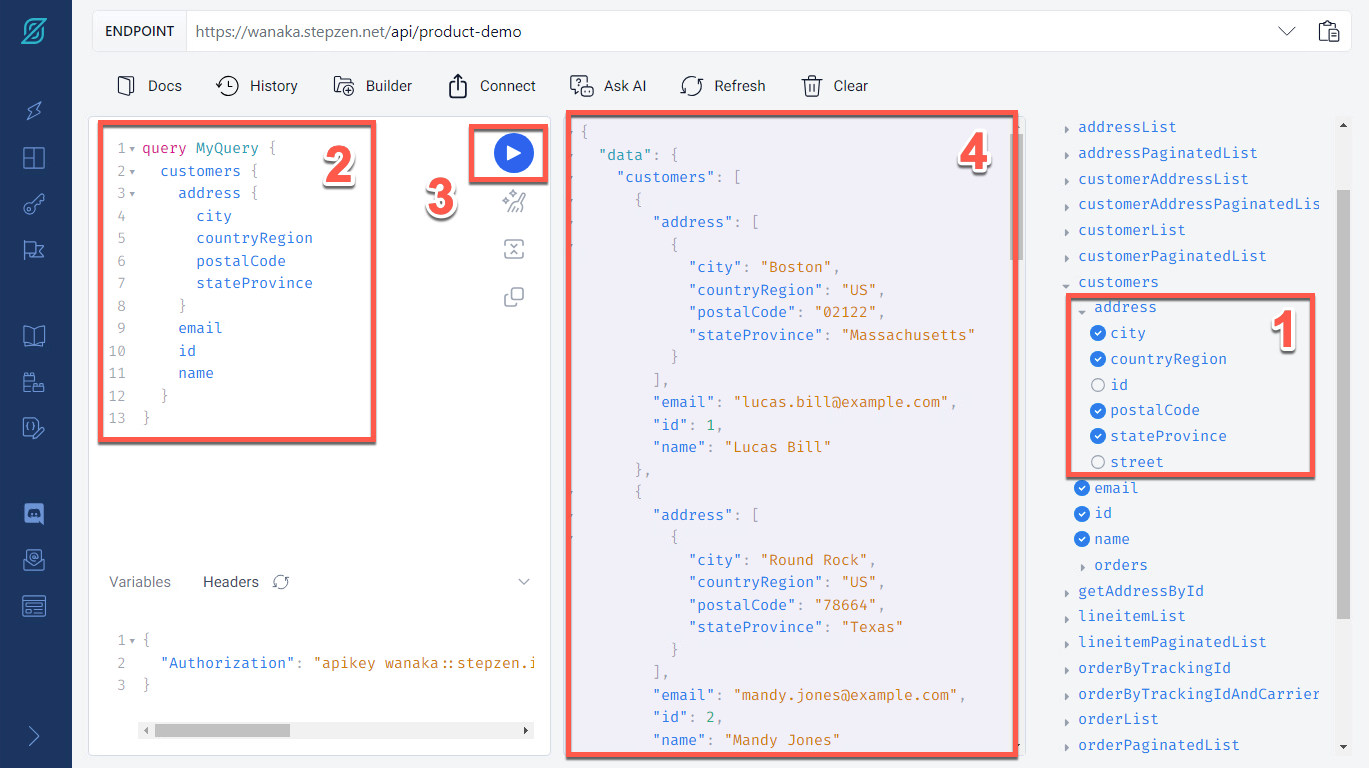 StepZen ダッシュボード ページで、ビルダー セクション (1) を使用して、住所属性を含む顧客クエリを作成します (2)。クエリを再度実行し (3)、結果データが Rest および MySQL データベースから取得されていることを確認します (4)。