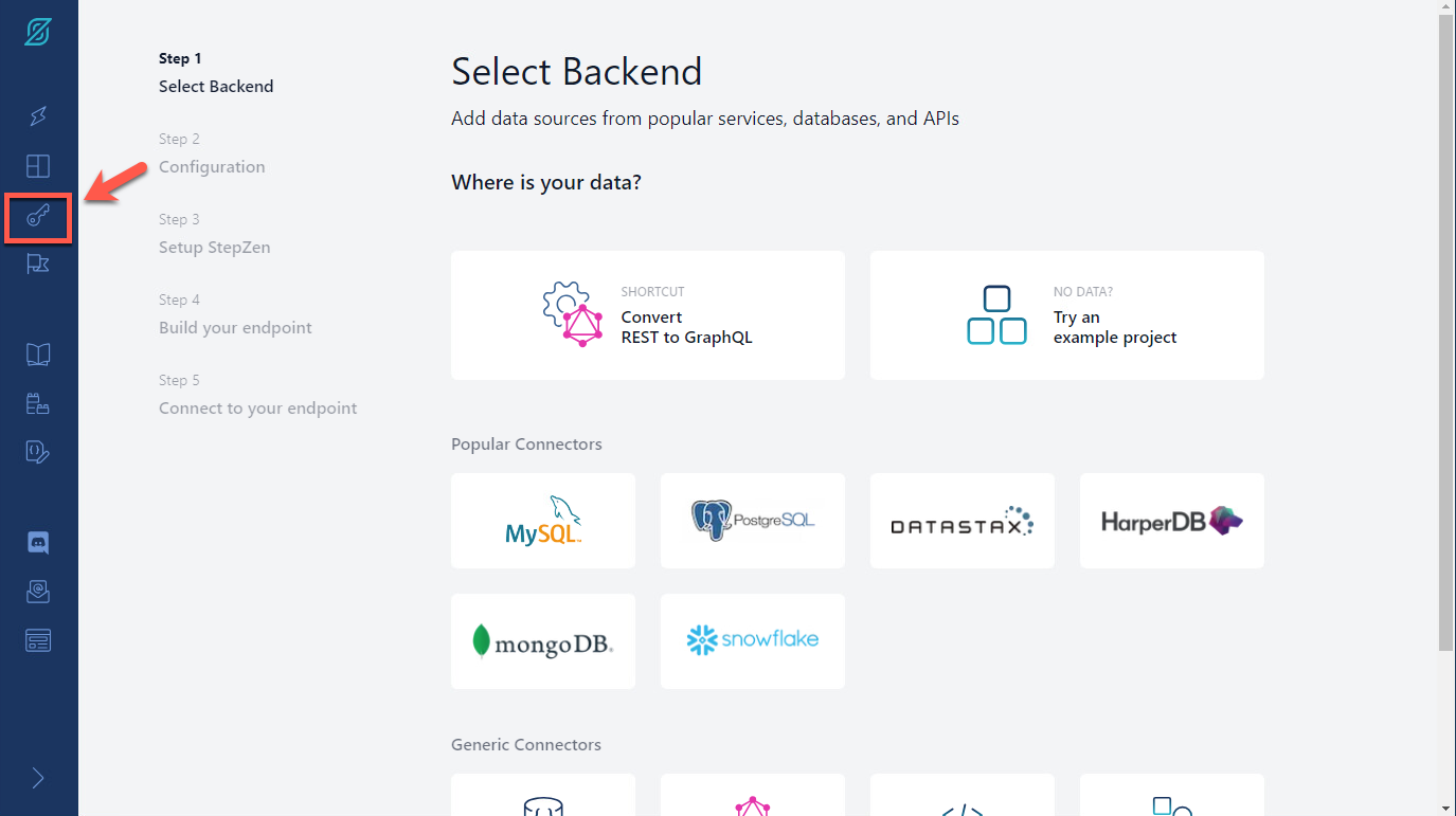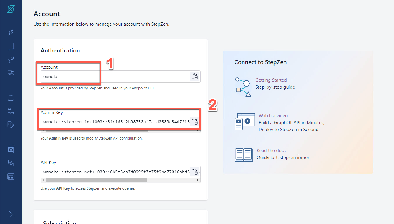 StepZen ダッシュボード ページの左側のメニューで、アカウント ページ (鍵のアイコン) を開きます。